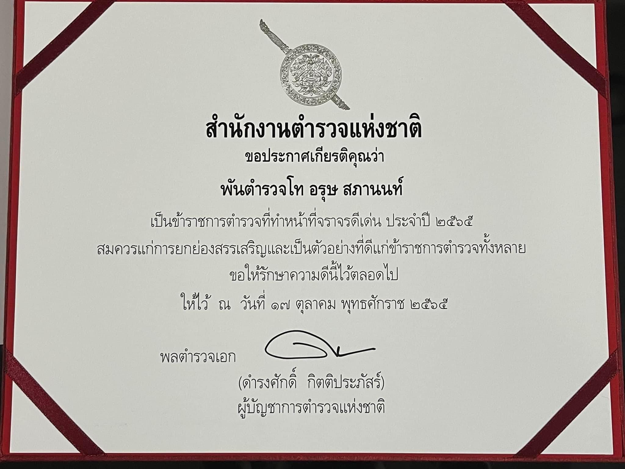 พ.ต.ท.อรุษ สภานนท์ กล่าวต่อว่า ที่ผ่านมาตนเองได้รับรางวัลข้าราชการตำรวจทำหน้าที่จราจรดีเด่นประจำปี 2565อันดับ 1 จาก ภ.2 และส่งรายชื่อไปยังสำนักงานตำรวจแห่งชาติเพื่อคัดเลือกในระดับประเทศต่อไป