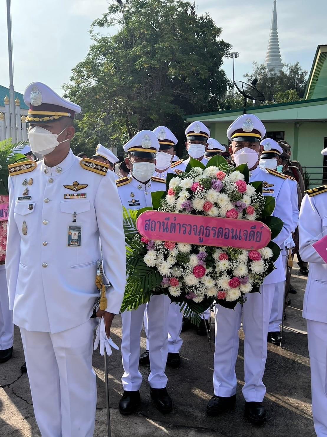 วันนี้ 23 ต.ค.65 เวลา 08.00 น. ที่บริเวณด้านหน้าหอประชุม อ.ดอนเจดีย์ จว.สุพรรณบุรี พ.ต.อ.เอกชัย ศรีเมือง ผกก.สภ.ดอนเจดีย์ พร้อมด้วย พ.ต.ต.ไชยา ประเสริฐ สวป.ฯ สภ.ดอนเจดีย์ และข้าราชการตำรวจในสังกัด ร่วมวางพวงมาลาถวายราชสักการะอนุสาวรีย์พระบาทสมเด็จพระจุลจอมเกล้าเจ้าอยู่หัว ในกิจกรรมน้อมรำลึกพระองค์ท่านเนื่องในวันคล้ายวันสวรรคต หรือวันปิยมหาราช วันที่ 23 ตุลาคม 2565 โดยมี นายปรียุทธ์ กังแฮ รักษาราชการแทนนายอำเภอดอนเจดีย์ เป็นประธานเปิดกิจกรรม