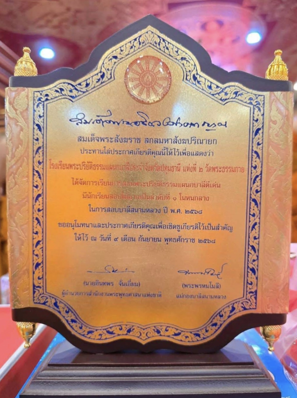 พิธีมอบรางวัลสำนักเรียน/สำนักศาสนศึกษาพระปริยัติธรรมแผนกบาลีดีเด่น ประจำปี พ.ศ.2568 จัดขึ้นโดย สำนักงานแม่กองบาลีสนามหลวง ร่วมกับสำนักงานพระพุทธศาสนาแห่งชาติ ในโอกาสนี้พระครูปลัดรัตนวีรวัฒน์ ได้นำพระภิกษุผู้สอบได้ประโยค ป.ธ.9 จำนวน 11 รูป เข้ารับการมุทิตาสักการะและนักเรียนบาลีศึกษา สำนักศาสนศึกษาวัดพระธรรมกาย ชั้นบาลีศึกษาประโยค 1-2 ถึง 8 จำนวน 40 ท่านเข้ารับประกาศนียบัตร, พัดบาลีศึกษา, เข็มที่ระลึก ผู้สอบได้ประโยคบาลีศึกษาปี พ.ศ.2568