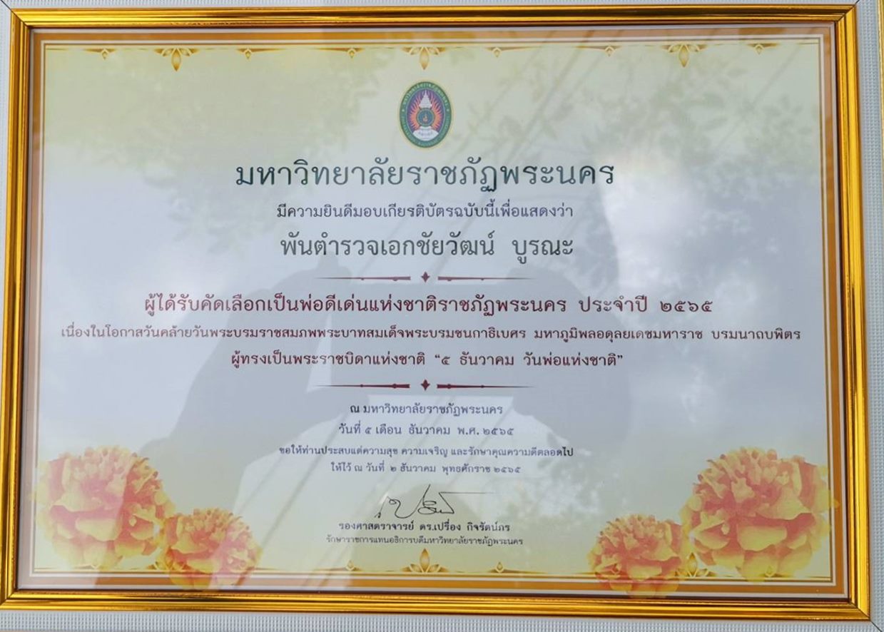 วันที่ 2 ธ.ค.2565 ที่ ณ หอประชุมภัทรมหาราช สำนักศิลปะและวัฒนธรรม มหาวิทยาลัยราชภัฏพระนคร ถนนแจ้งวัฒนะ เขตบางเขน กรุงเทพฯ พ.ต.อ.ชัยวัฒน์ บูรณะ ผกก.ฝวท.2 ร่วมรับรางวัลเกียรติบัตรพ่อดีเด่นแห่งชาติราชภัฎพระนคร จากรางวัลเกียรติบัตรพ่อดีเด่นแห่งชาติ 165 คน ทั่วประเทศ