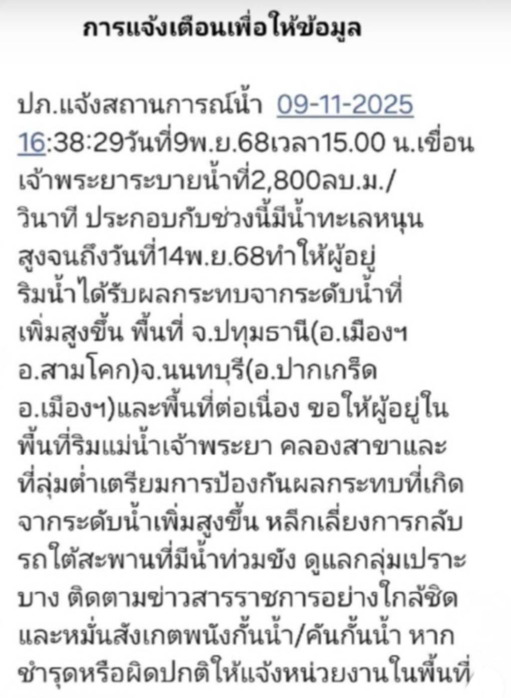 ด้าน ร้อยตำรวจเอก ดร.ตรีลุพธ์ ธูปกระจ่าง นายกเทศมนตรีนครรังสิต กล่าวว่า ในเรื่องของ sms เตือนภัย อยากขอให้ประชาชนทำความเข้าใจ อย่าตื่นตกใจ เพราะ สถานการณ์จะกระทบอยู่กับประชาชนที่อาศัยริมแม่น้ำเจ้าพระยา ก็จะมีข้อความที่ระบุไว้ว่าริมแม่น้ำอันนี้จะเกิดผลกระทบ เราเต้องเตรียมความพร้อมให้ดี และฟังจากการประชาสัมพันธ์ให้ดี ส่วนพื้นที่อื่นๆ และรังสิตยังไม่ต้องวิตกกังวล และเราจะมีการประชาสัมพันธ์ให้ทราบเป็นระยะๆถ้าจะอธิบายให้ประชาชนเข้าใจง่าย ๆคือให้ประชาชนคิดเอาไว้เลยว่าระดับน้ำจะสูงเท่ากับประมาณปี 2565 เป็นเกณต์ บ้านไหนที่ได้รับผลกระทบ บ้านนั้นก็ต้องเตรียมความพร้อมเอาไว้ ส่วนบ้านไหนไม่ได้รับผลกระทบจากน้ำปี 2565 ก็รอฟังการประชาสัมพันธ์ ว่าระดับน้ำจะมากเกินปี 2565 หรือเปล่า