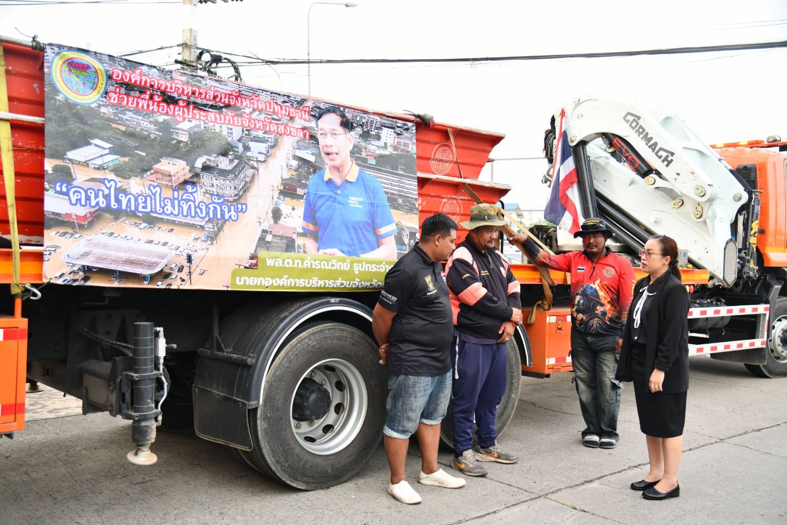 โดยขบวนคาราวานดังกล่าวมี นายนพพร ขาวขำ รองนายกองค์การบริหารส่วนจังหวัดปทุมธานี พร้อมด้วยนายอดิสร อยู่นาน สมาชิกสภาองค์การบริหารส่วนจังหวัดปทุมธานี นำเจ้าหน้าที่กองป้องกันและบรรเทาสาธารณภัยพร้อมรถยนต์ เรือยนต์ เจ็ตสกี เครื่องจักรกล ครุภัณฑ์ และอุปกรณ์ ลงพื้นที่จังหวัดสงขลาด้วยรถบรรทุกขนส่ง และมีการนำ เจ็ตสกีจำนวนสี่เครื่องขึ้นเครื่องบิน C130 เพื่อร่วมให้ความช่วยเหลือผู้ประสบอุทกภัยอย่างเร่งด่วน