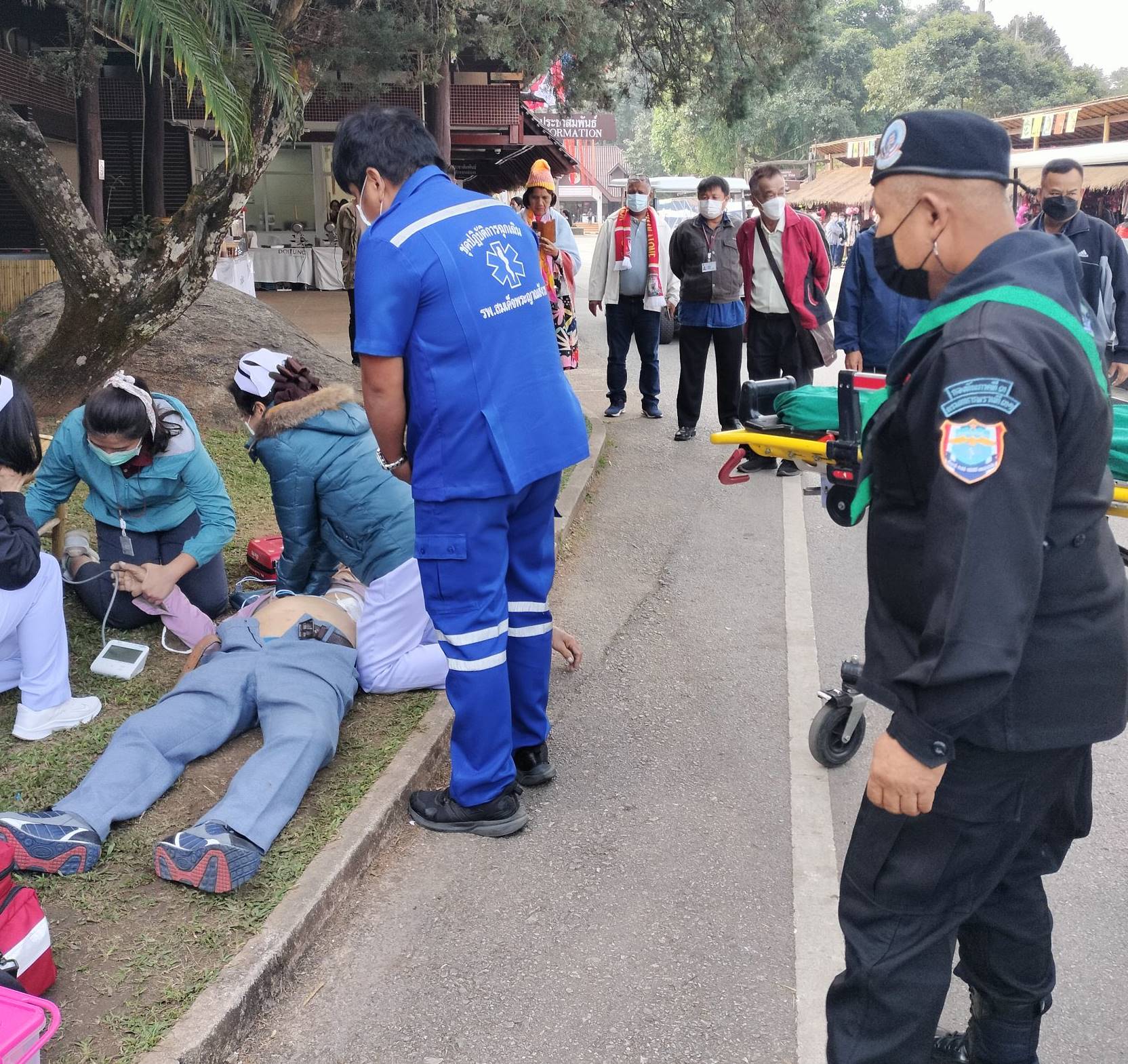 ต่อมาเมื่อเวลา 09.00 นาฬิกา ได้รับแจ้งว่ามีนักท่องเที่ยวเป็นชายหมดสติ คาดว่าเกิดจากภาวะหัวใจวายเฉียบพลัน หน่วยจึงได้ประสานให้เจ้าหน้าที่ของโรงพยาบาลแม่ฟ้าหลวงที่ปฏิบัติภารกิจ ณ โครงการพัฒนาดอยตุงฯ อยู่ในขณะนั้น เข้าให้การช่วยเหลืออย่างเร่งด่วน โดยหน่วยได้อำนวยความสะดวกในการช่วยเหลือดังกล่าว หลังจากได้ทำการปฐมพยาบาลเบื้องต้นแล้ว เจ้าหน้าที่ได้นำผู้ป่วยส่งไปยังโรงพยาบาลแม่จัน เพื่อทำการรักษาต่อไป