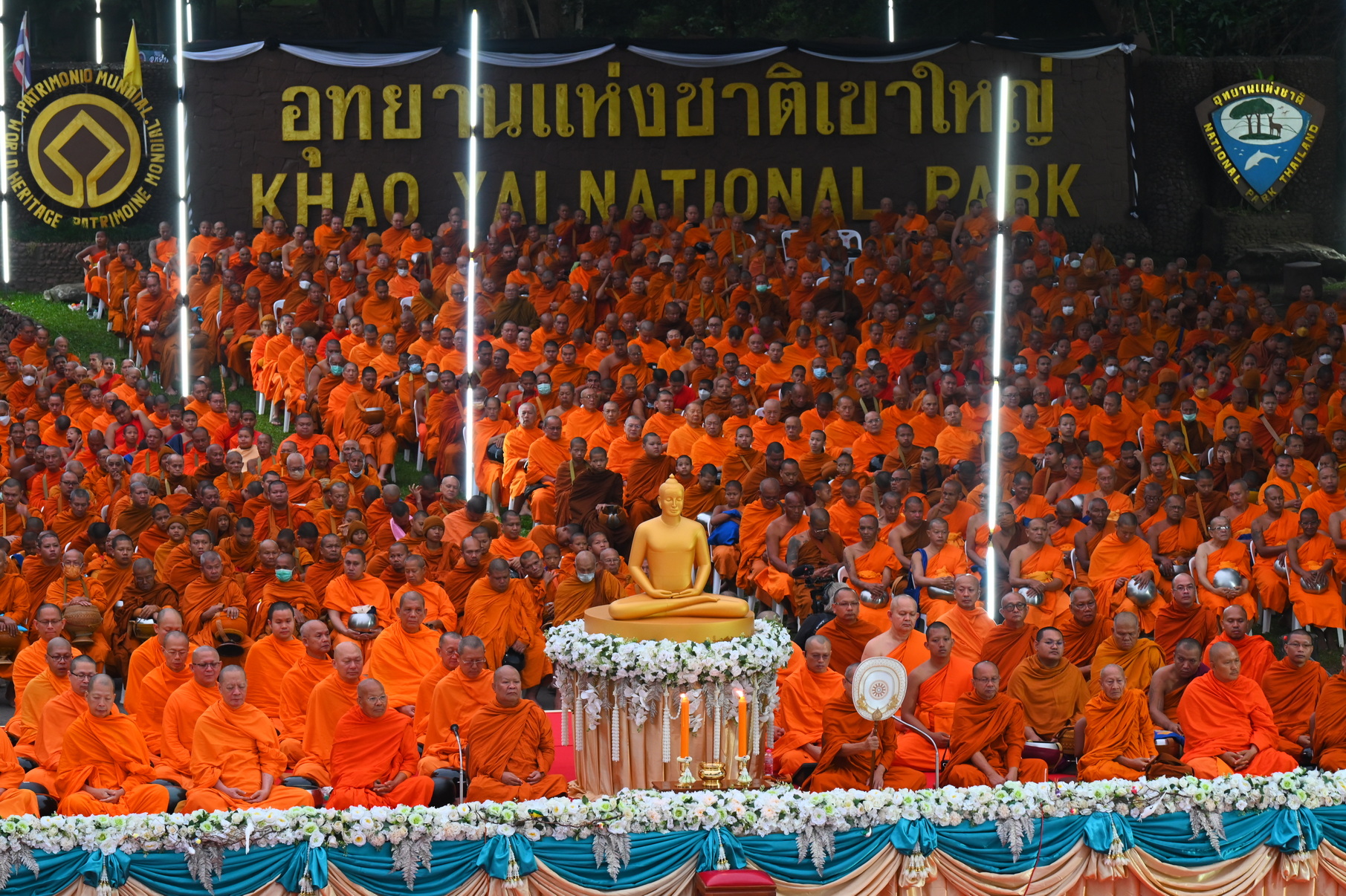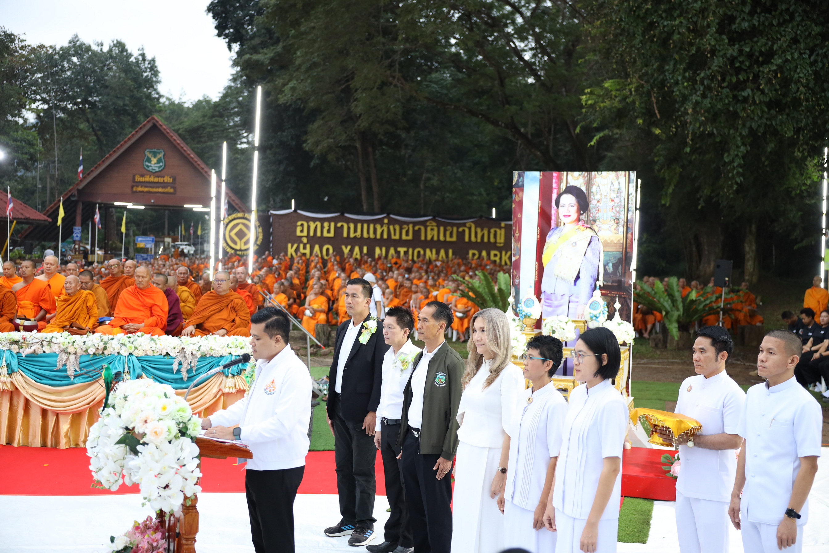 บรรยากาศในพิธีมี พระราชวัชรคุณบัณฑิต รองเจ้าคณะจังหวัดนครราชสีมา เจ้าอาวาสวัดด่านใน ประธานสงฆ์พิธีฯ , นายคณัสชนม์ ศรีเจริญ รองผู้ว่าราชการจังหวัดนครราชสีมา ผู้แทนผู้ว่าราชการจังหวัดนครราชสีมา เป็นประธานฝ่ายฆราวาส พร้อมด้วย ดร.พรพนา ศรีการุณ ผู้อำนวยการสำนักงานพระพุทธศาสนาจังหวัดนครราชสีมา นายชัยยา ห้วยหงษ์ทอง หัวหน้าอุทยานแห่งชาติเขาใหญ่ และ พ.ต.ณัฐพงศ์ ทองดี ปลัดอาวุโสอำเภอปากช่อง พุทธศาสนิกชนได้พร้อมใจกันแสดงตนเป็นพุทธมามกะ อาราธนาศีล 5 เจริญสมาธิภาวนาถวายเป็นพระราชกุศลแด่ สมเด็จพระนางเจ้าสิริกิติ์ พระบรมราชินีนาถ พระบรมราชชนนีพันปีหลวง ประธานในพิธีนำถวายไทยธรรมเป็นสังฆทาน ประธานสงฆ์ได้เผดียงอาหารตักบาตรเพื่อนำไปมอบให้คณะสงฆ์ 323 วัด และเจ้าหน้าที่ทหารตำรวจในพื้นที่ 4 จังหวัดภาคใต้ อีกทั้งช่วยเหลือบรรเทาทุกข์ผู้ประสบภัยในทุกภูมิภาคของประเทศไทย จากนั้นคณะสงฆ์ 1,000 รูปแปรแถวรับบิณฑบาต