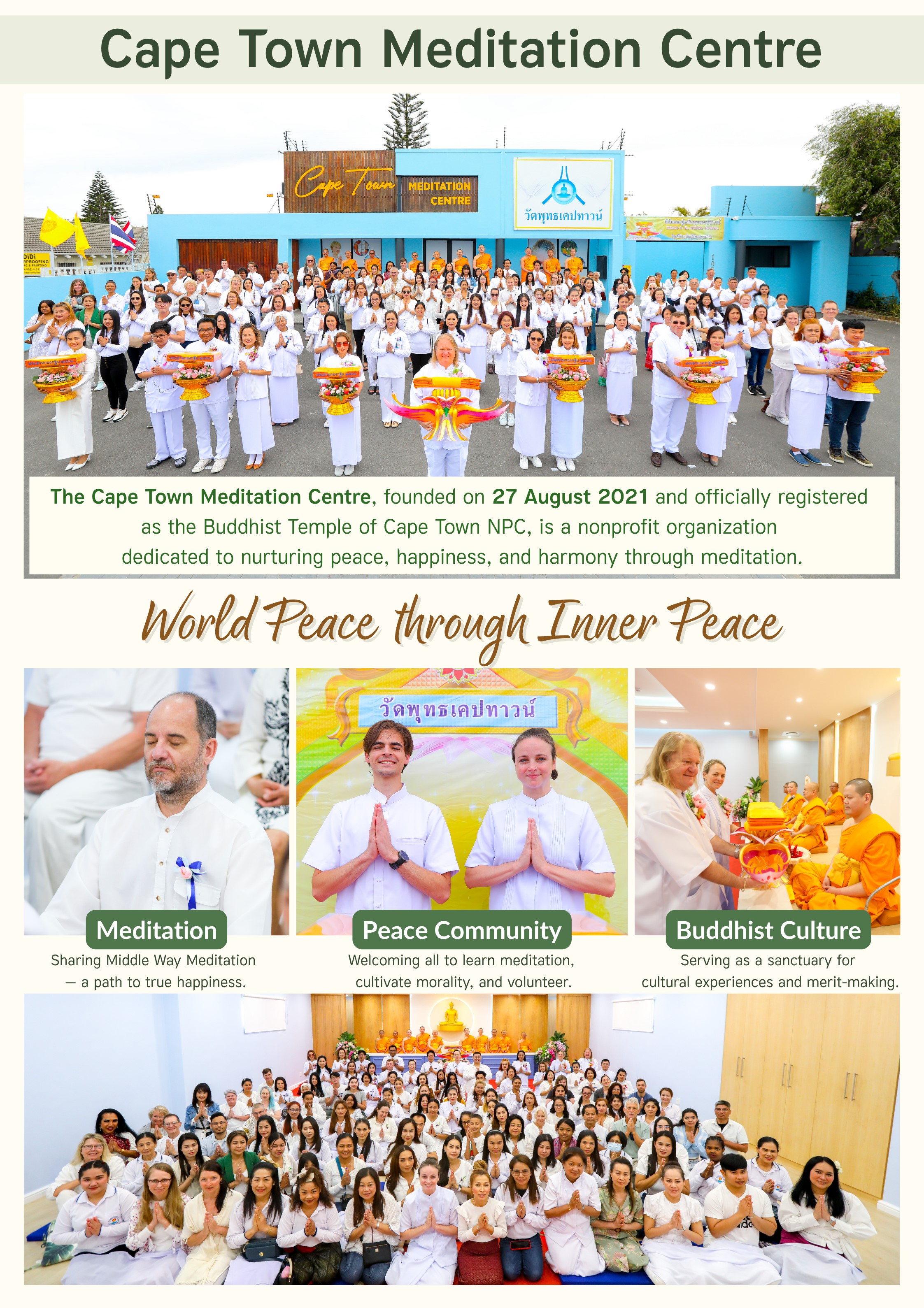 “การทำงานในสังคมพหุวัฒนธรรมของเมืองเคปทาวน์ ทำให้ชาวแอฟริกาได้สัมผัสหลักเมตตา ความกรุณา และสันติ ผ่านการปฏิบัติสมาธิ ฟังธรรม ส่งผลให้เกิดความเข้าใจในพระพุทธศาสนามากขึ้น ดังนั้น จึงขอเชิญพุทธศาสนิกชนทั่วโลกมาร่วมเป็นหนึ่งในการสร้างศูนย์กลางแห่งสันติสุข สร้างวัดพุทธเคปทาวน์ให้เป็นแสงสว่างกลางนครเคปทาวน์ เพื่อประโยชน์แก่ชาวไทย ชาวแอฟริกา และผู้แสวงหาธรรมทั่วโลก ในพิธีสมโภชรูปหล่อ พระมงคลเทพมุนี (สด จนฺทสโร) องค์แรกในทวีปแอฟริกา ซึ่งจัดขึ้นวันที่ 8 มีนาคม พ.ศ. 2569 โดยติดต่อสอบการร่วมบุญที่ โทร. 081-401-7191 และ 090-989-8275 หรือติดตามข่าวสารงานบุญวัดพุทธเคปทาวน์ได้ที่ Facebook วัดพุทธเคปทาวน์ สาธารณรัฐแอฟริกาใต้ ทวีปแอฟริกา : https://www.facebook.com/wad.phuthth.khep.thawn.satharnrath.x.fr และ เว็บไซต์ Cape Town Meditation Center” พระภูวิชญ์กล่าว