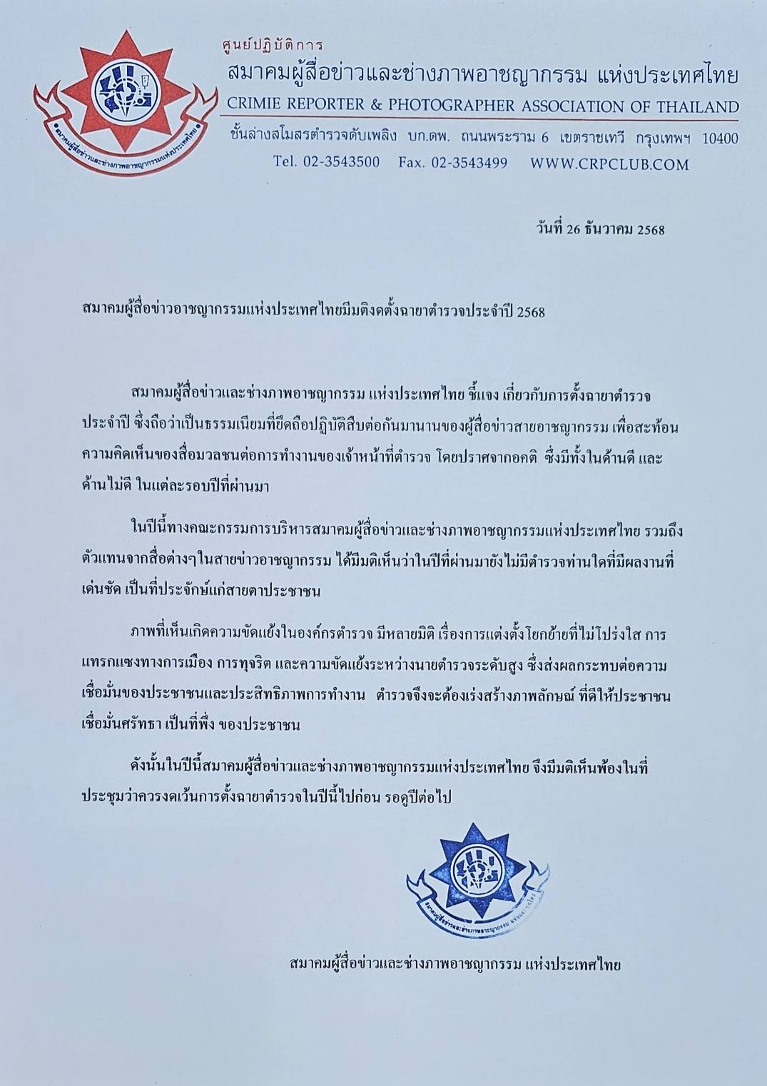 วันที่ 26 ธ.ค.68 สมาคมผู้สื่อข่าวและช่างภาพอาชญากรรมแห่งประเทศไทย ได้ออกแถลงการณ์ เรื่อง มีมติงดตั้งฉายาเจ้าหน้าที่ตำรวจประจำปี 2568 โดยคำแถลงการณ์ระบุว่า ตามที่สมาคมผู้สื่อข่าวและช่างภาพอาชญากรรม แห่งประเทศไทย ได้มีการตั้งฉายาตำรวจเป็นประจำปีทุกปี ซึ่งถือว่าเป็นธรรมเนียมที่ยึดถือปฏิบัติสืบต่อกันมานานของผู้สื่อข่าวสายอาชญากรรม เพื่อสะท้อนความคิดเห็นของสื่อมวลชนต่อการทำงานของเจ้าหน้าที่ตำรวจ โดยปราศจากอคติ ซึ่งมีทั้งในด้านดี และด้านไม่ดีในแต่ละรอบปีที่ผ่านมา