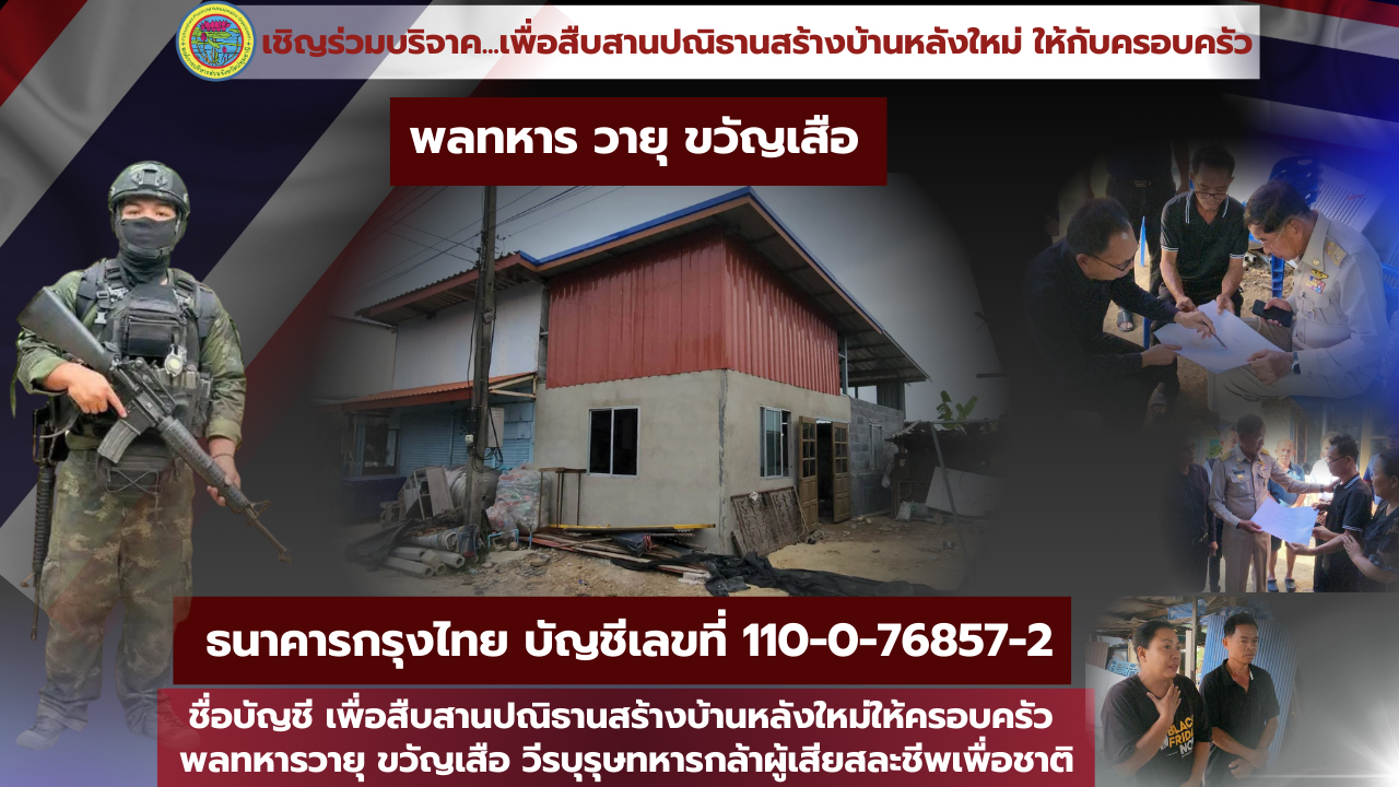 โดย พล.ต.ท.คำรณวิทย์ ธูปกระจ่าง นายกองค์การบริหารส่วนจังหวัดปทุมธานี เปิดเผยว่า ขณะนี้มีผู้ร่วมบริจาคเบื้องต้นแล้วกว่า 400,000 บาท และยังมี ผู้สนับสนุนวัสดุก่อสร้างอีกจำนวนหลายราย และเพื่อให้การดำเนินการเป็นไปอย่างโปร่งใสและบรรลุวัตถุประสงค์ จึงได้มีการประสานงานเปิดบัญชีเฉพาะกิจเพื่อการนี้โดยเฉพาะ สำหรับจัดซื้อวัสดุอุปกรณ์และเป็นค่าแรงในการก่อสร้างโดยผู้ประสงค์จะบริจาคท่านสามารถร่วมเป็นส่วนหนึ่งในการเชิดชูเกียรติและช่วยเหลือครอบครัวพลทหารวายุ ได้ที่ ธนาคาร กรุงไทย เลขที่บัญชี: 110-0-76857-2 ชื่อบัญชี: เพื่อสืบสานปณิธานสร้างบ้านหลังใหม่ให้ครอบครัวพลทหารวายุ ขวัญเสือ วีรบุรุษทหารกล้าผู้เสียสละชีพเพื่อชาติ