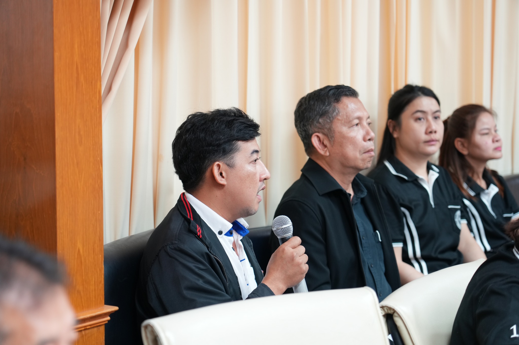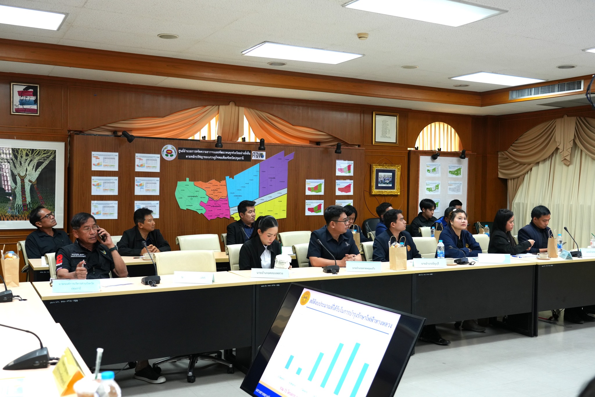 ในที่ประชุม พล.ต.ท. คำรณวิทย์ (บิ๊กแจ๊ส) ได้สะท้อนความอัดอั้นใจต่อการปฎิบัติหน้าที่ของข้าราชการประจำ โดยระบุว่าปัญหาไฟส่องสว่างถูกทิ้งไว้มานานเกินไป ซึ่งตนเคยเสนอเรื่องตั้งแต่สมัย นายภาสกร บุญญลักษม์ เป็นผู้ว่าฯ จนถึงปัจจุบันเปลี่ยนผู้ว่าฯ มาถึง 3 ท่านแล้ว ปัญหาก็ยังอยู่ที่เดิม มีเพียงการรับปากในที่ประชุมแต่ไม่มีการลงมือทำจริง ผมรับไม่ได้ที่ประชาชนต้องเดือดร้อนเพราะการปฏิบัติหน้าที่ของข้าราชการประจำ ประชุมกันกี่ครั้งก็เหมือนเดิม มันมืดขนาดไหน ประชาชนร้องเรียนเข้ามามหาศาล แต่อุบัติเหตุก็ยังเกิดซ้ำซาก แล้วที่ดูจากคลิป ที่ท่าน นายอำเภอแต่ละท่านไปทำมา เปืดให้ดูมันมืดเนี่ยมันขนาดไหน ที่สำคัญประชาชนร้องกันเข้ามาเยอะมาก และอุบัติเหตุเกิดมาก ผมประชุม กก.ตร. ผมก็ย้ำกับตำรวจ ให้ทำอย่างเต็มที่ในการจับกุม โจรขโมยสายไฟ แต่ปัญหาที่เรื้อรังอันนี้ ผมเชื่อว่าประชุมกันไปก็ยังคงเป็นเช่นเดิม ซึ่งเมื่อเช้าผมไปเปิดถนนโลคัลโรด ที่ทาง อบจ.ได้ ทำ mou กับการรถไฟ ตอนนี้เราทำเสร็จแล้วเปิดให้ประชาชนใช้ และในเดือนเมษายน ไฟจะสว่างทั้ง 2 ข้างของถนน และจะเป็นถนนตัวอย่าง จากเขตปทุม ไปถึง กทม. แต่ในส่วนเส้นอื่นๆ ของปทุมธานี ตอนนี้ประชาชนตำหนิเข้ามากันเยอะ เขาไม่รู้หรอกว่าใครรับผิดชอบ ผมเคยแจ้งไปแล้วในสมัยท่านผู้ว่า นายภาสกร บุญญลักษม์ ว่า ถ้าคุณไม่พร้อมดำเนินการให้บอกมา และมันก็หายเงียบไป คุณก็ไม่ทำ ผมขอพูดเรื่องจริง ผมรับไม่ได้ที่ประชาชน เดือดร้อนเพราะการปฎิบัติหน้าที่ของข้าราชการประจำ แต่ตอนนี้คนมาโทษใคร เขาบอกกันว่า อบจ.คุณดูนะ 7,031 ดวง อยู่ในความรับผิดชอบของ อบจ. ตอนนี้ดับอยู่ 264 ดวง ผมก็ให้ทางเจ้าหน้าที่ อบจ.ไปทำให้ติดให้หมด ผมไม่ยอมแล้ว ผมจะพูดกับผู้ใหญ่หลายๆ คนแล้ว ผมไม่ยอม เราทำแบบนี้ได้ไหม ตามที่ท่านผู้ว่า ท่านรองผู้ว่า พูดไว้ ทำ mou ใหม่ เฉพาะไฟฟ้าทั้งจังหวัดปทุมธานี อบจ.รับผิดชอบให้ แค่ให้คุณส่งมอบมา เอาไหม ผมจะได้รีบเอาเข้าแผนตั้งงบประมาณเลย เพื่อไฟสว่างทั้งปทุม สัก 100 ล้าน ผมรับผิดชอบให้ เพราะผมรับไม่ได้ชาวปทุมเดือดร้อน แต่ที่ผ่านมาพูดกัน น้องก็ไม่ทำ ไหนลองบอกว่าน้องทำถึงไหน ตั้งแต่ทำ mou ในสมัยท่านภาสกร ให้ อบจ.รับผิดชอบ ผ่านไป 2 ปีแล้วครับ ผมเอาเรื่องจริงมาพูด ผมไม่ยอมแล้ว ผมโวยแน่นอนถ้ายังมืดแบบนี้ ที่อื่นทำไมเขาสว่างได้ แต่ปทุม เข้า 2 ผู้ว่าแล้ว ตอนนี้ ผู้ว่าที่ 3 แล้ว คุณเป็นแขวง คุณก็ไม่เดินหน้า ไฟในปทุม ไม่ว่าแขวงชนบท หรือ ทางหลวง เราทำ mou ใหม่ใหม่ให้ท่าน ผู้ว่าเป็นผู้นำ เอามาผมรับผิดชอบเ