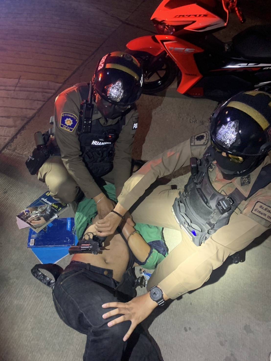 จากการตรวจค้นพบอาวุธปืนลูกโม่ไทยประดิษฐ์ขนาด .38 และเครื่องกระสุนปืน .38 จำนวน 5 นัดซุกซ่อนอยู่ภายในป้ากางเกงของนายนราธิป ซึ่งเป็นคนซ้อน พร้อมยอมรับว่าอาวุธปืนดังกล่าวเป็นของตนจริง