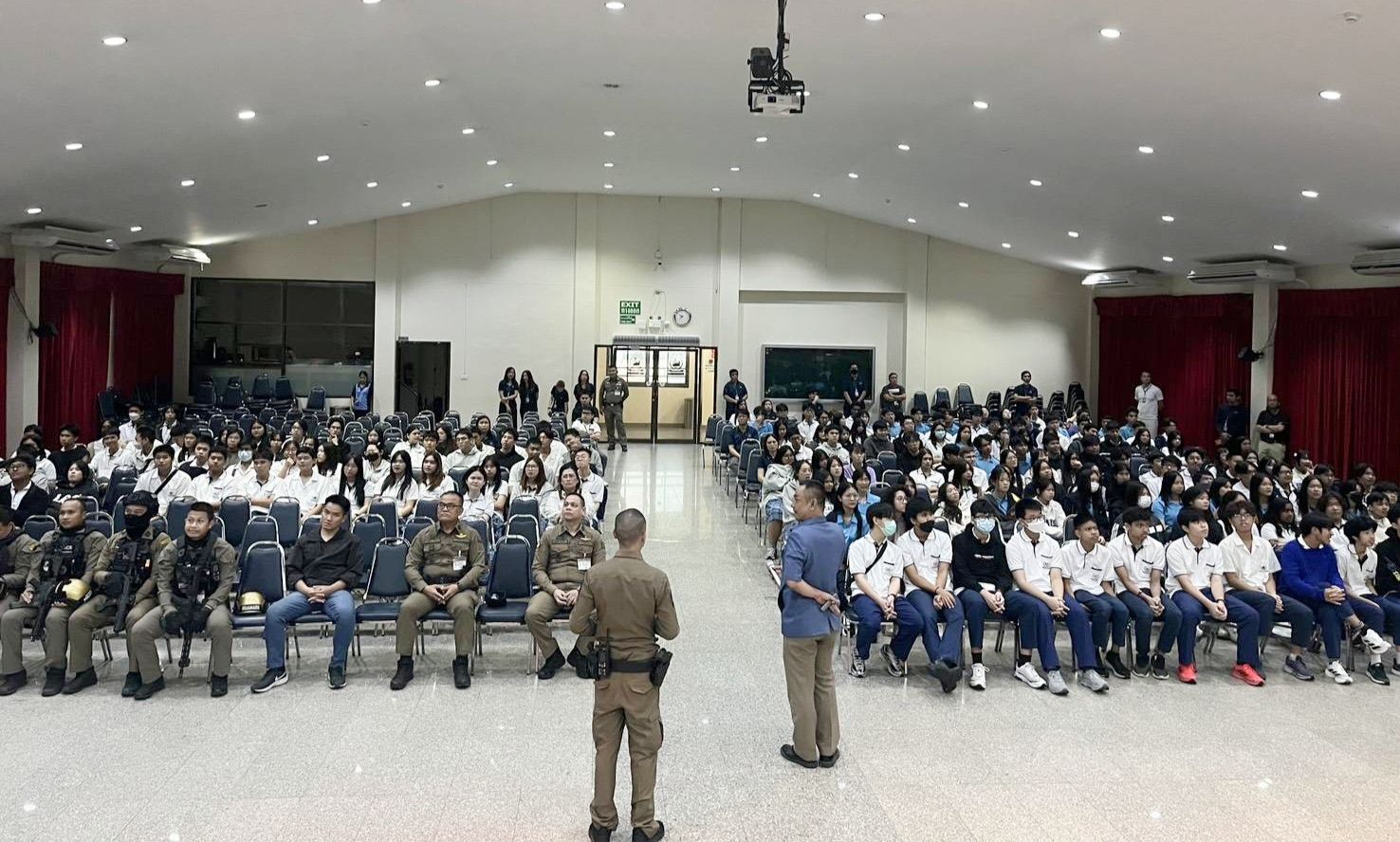 ด้าน พ.ต.ท.สวภณ คะอังกุ สวป.สน.หัวหมาก กล่าวว่า เนื่องจากในสภาวการณ์ปัจจุบัน มีผู้ก่อเหตุภายในสถานศึกษาอยู่บ่อยครั้ง โดยสาเหตุหลักมาจากปัญหายาเสพติด ซึ่งทำให้ผู้กระทำความผิดเกิดอาการคลุ้มคลั่งและเข้าไปก่อเหตุอันตราย ตามสถานที่ต่างๆ สน.หัวหมาก จึงเล็งเห็นความสำคัญของปัญหาดังกล่าว จึงนำนโยบายของ สำนักงานตำรวจแห่งชาติ ในโครงการ “หนี ซ่อน สู้ ” หรือ Run Hide Fight ซึ่งเป็นหลักสากลที่ FBI และ หน่วยงานบังคับใช้กฎหมายในหลายๆประเทศ นำมาใช้แนะนำประชาชนในการเอาชีวิตรอดในเหตุกราดยิง (Active Shooter) โดยเฉพาะในสถานศึกษาและสถานประกอบการต่างๆ เพื่อให้ประชาชนรู้วิธีเอาตัวรอดและช่วยเหลือผู้อื่นเมื่อเกิดเหตุไม่คาดคิด