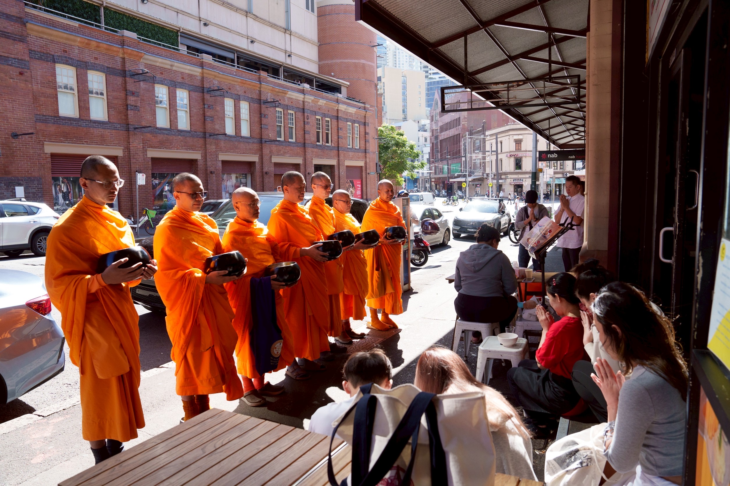 กิจกรรมในช่วงเช้าเริ่มต้นด้วยพิธีตักบาตรพระสงฆ์จำนวน 7 รูป จากวัดพระธรรมกายซิดนีย์และวัดพระธรรมกายเมลเบิร์น โดยจัดจุดรับบาตรจำนวน 8 จุด กระจายอยู่ภายในพื้นที่ไทยทาวน์ มีพุทธศาสนิกชนชาวไทย ชาวลาว ชาวเวียดนาม ตลอดจนชาวต่างชาติและชาวท้องถิ่นเข้าร่วมใส่บาตรกว่า 100 คน ภาพพระสงฆ์เดินรับบิณฑบาตอย่างสงบงามท่ามกลางย่านธุรกิจและอาคารสูงของมหานครซิดนีย์ สร้างความประทับใจแก่ผู้พบเห็นเป็นอย่างมาก และสะท้อนถึงการสืบสานพระพุทธศาสนาในต่างแดน โดยกิจกรรมตักบาตรในย่านไทยทาวน์ซิดนีย์จัดขึ้นอย่างต่อเนื่องมานานกว่า 18 ปี