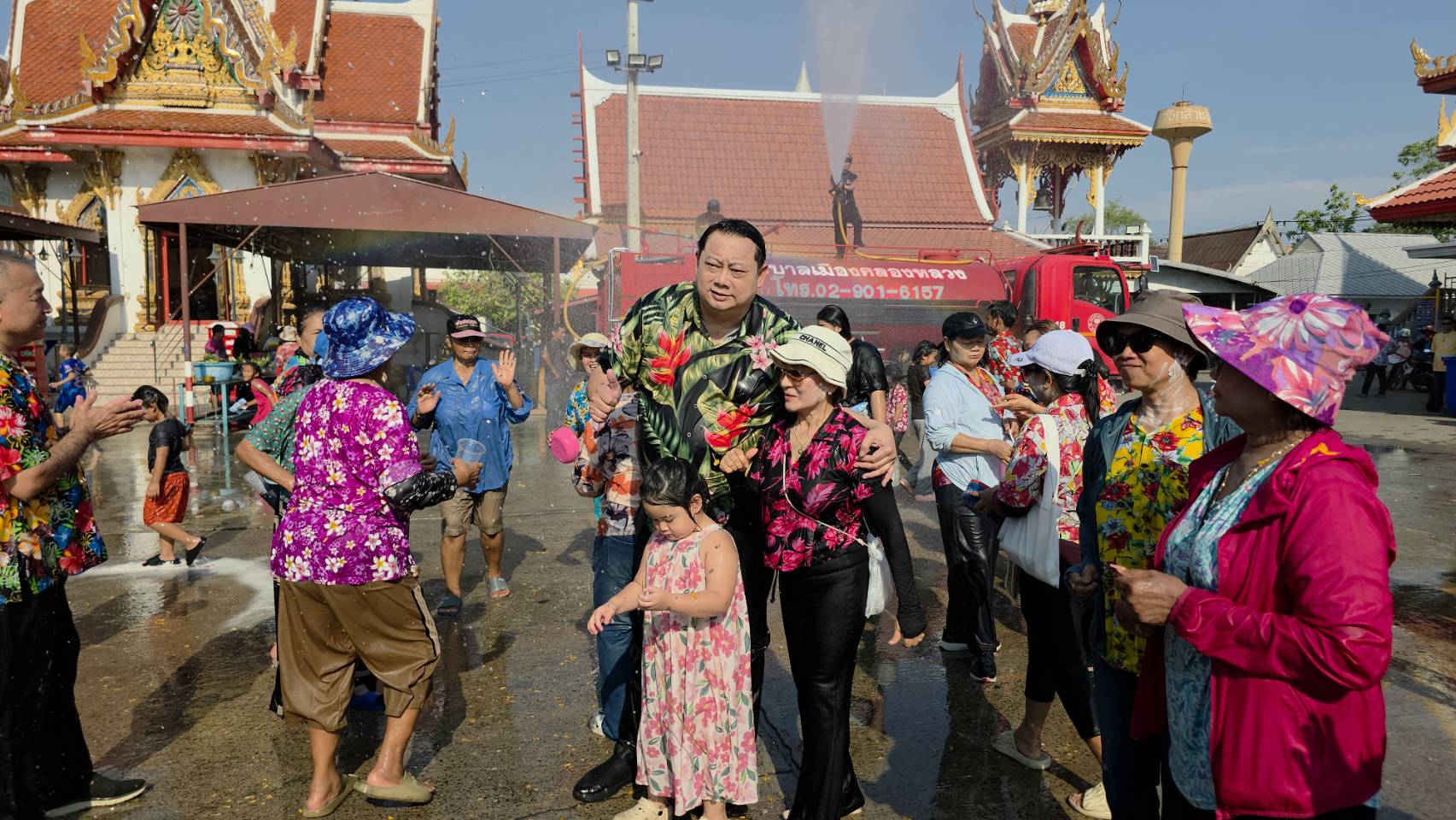 ไฮไลต์ที่สร้างเสียงฮือฮาและรอยยิ้มให้กับเด็กๆ และประชาชนที่มาร่วมงาน คือการจัดทำ "ฝนเทียม" โดยเจ้าหน้าที่ป้องกันและบรรเทาสาธารณภัย (ปภ.) เทศบาลเมืองคลองหลวง ได้นำรถน้ำมาฉีดพ่นละอองน้ำเป็นสายฝนชุ่มฉ่ำทั่วลานวัด เพื่อช่วยลดอุณหภูมิจากอากาศที่ร้อนจัด ทำให้บรรยากาศการเล่นน้ำสงกรานต์เต็มไปด้วยความสนุกสนานและเป็นกันเอง