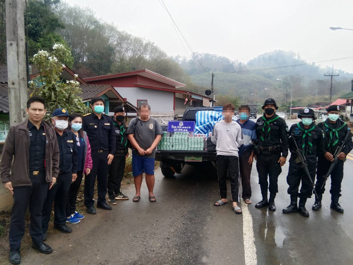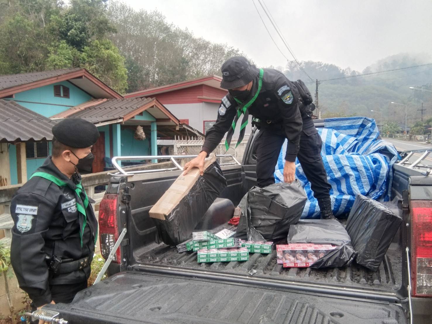 เมื่อวันที่ 17 กุมภาพันธ์ 2566 เวลา 12.30 น.ที่ผ่านมาหน่วยเฉพาะกิจทัพเจ้าตาก กองกำลังผาเมือง โดย กองร้อยทหารพรานที่ 3106 หน่วยเฉพาะกิจกรมทหารพรานที่ 31 จัดกำลังพล 1 ชุดปฏิบัติการ ทำการจัดตั้งจุดตรวจเพื่อสกัดกั้นและป้องกันการกระทำความผิดกฎหมาย บริเวณหน้าฐานปฏิบัติการ บ้านห้วยส้าน หมู่ 4 ตำบลภูซาง อำเภอภูซาง จังหวัดพะเยา ผลการปฏิบัติสามารถจับกุมผู้ต้องหา จำนวน 3 คน พร้อมของกลาง บุหรี่หนีภาษี (บุหรี่ซิกกาแลตที่มิได้เสียภาษีตาม พระราชบัญญัติภาษีสรรพสามิต พ.ศ.2560) ยี่ห้อบาสตอส จำนวน 120 หีบๆ ละ 10 ซอง รวมบุหรี่ทั้งหมด 1,200 ซอง ซุกซ่อนบริเวณหลังรถกระบะ ยี่ห้อโตโยต้า สีเทา หมายเลขทะเบียน บพ 3993 พะเยา ซึ่งขับผ่านมายังบริเวณจุดตรวจ จากการสอบถามรับสารภาพว่าได้ซื้อมาจากราษฎรของสาธารณรัฐประชาธิปไตยประชาชนลาว หน่วยจึงได้ประสานเจ้าหน้าที่ด่านศุลกากรเชียงของ และเจ้าหน้าที่สรรพสามิต เพื่อร่วมตรวจยึดของกลางดังกล่าว โดยผู้ต้องหารับสารภาพตลอดข้อกล่าวหา จึงได้นำตัวผู้ต้องหาพร้อมของกลางส่งสถานีตำรวจภูธรภูซาง เพื่อดำเนินการตามกฎหมายต่อไป