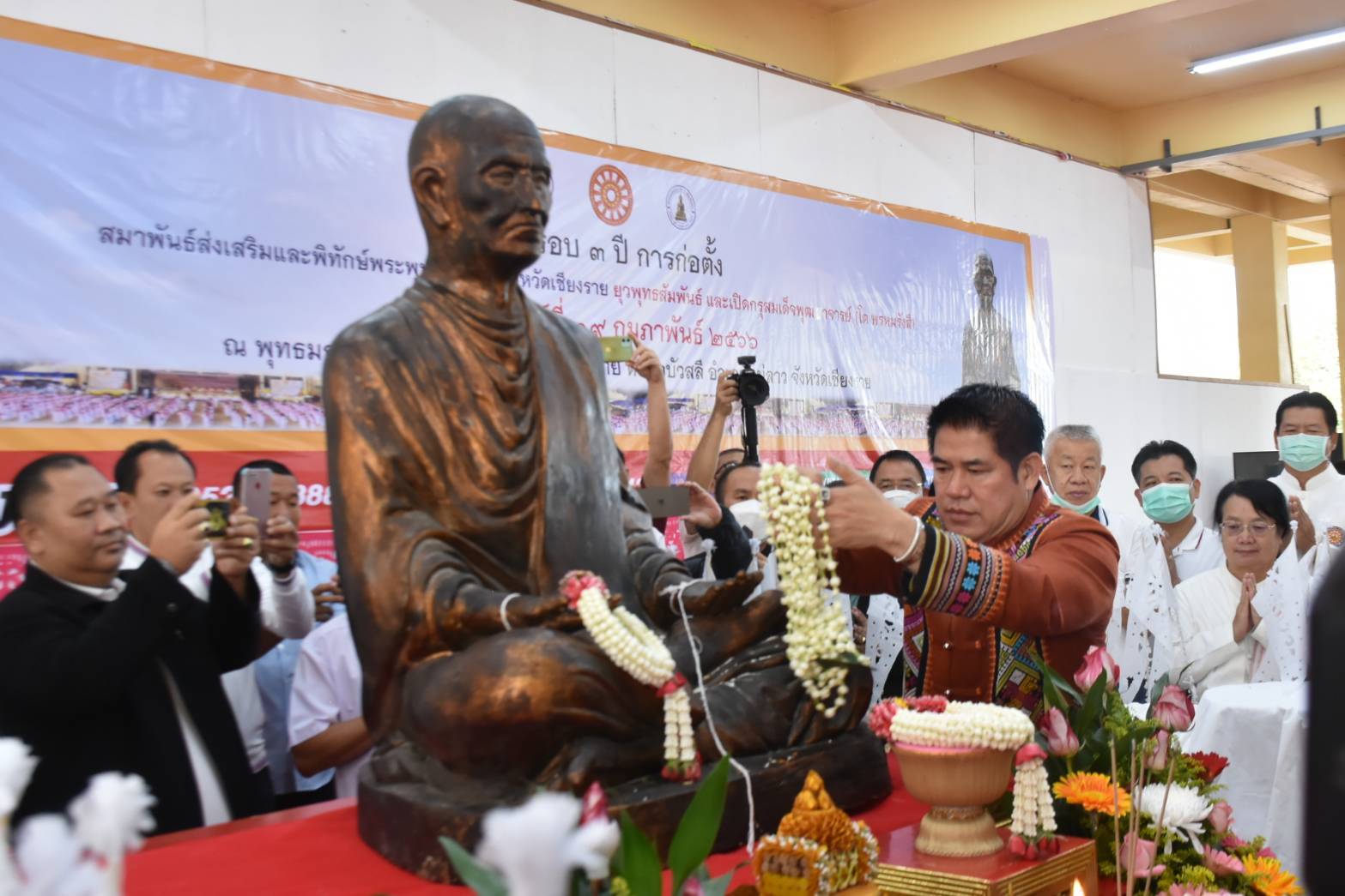 วันที่ 19 ก.พ. 66 ที่พุทธมณฑลสมโภช 750 ปี เมืองเชียงราย ต.บัวสลี อ.แม่ลาว จ.เชียงราย ร.อ.ธรรมนัส พรหมเผ่า ส.ส.พะเยา เขต 1 พรรคพลังประชารัฐ และอดีต รมว.กระทรวงเกษตรและสหกรณ์ พร้อมด้วย น.ส.ธนพร ศรีวิราช ภริยา ร่วมพิธีคณะสงฆ์จังหวัดเชียงรายและพุทธศาสนิกชน จัดงานครบรอบ 3 ปี การก่อตั้งสมาพันธ์ส่งเสริมและพิทักษ์พระพุทธศาสนาจังหวัดเชียงราย-ยุวพุทธสัมพันธ์ และเปิดกรุใต้ฐานรูปเหมือนสมเด็จพุฒาจารย์ (โต พรหมรังสี) 150 ปี โดยมีพระพุทธิญาณมุนี เจ้าอาวาสวัดพระธาตุผาเงาในฐานะเจ้าคณะจังหวัดเชียงรายเป็นประธาน และคณะสงฆ์ทั่วทั้งจังหวัดร่วมสวดเจริญพระพุทธมนต์ โดยประชาชนเข้าร่วมงานจำนวนมาก