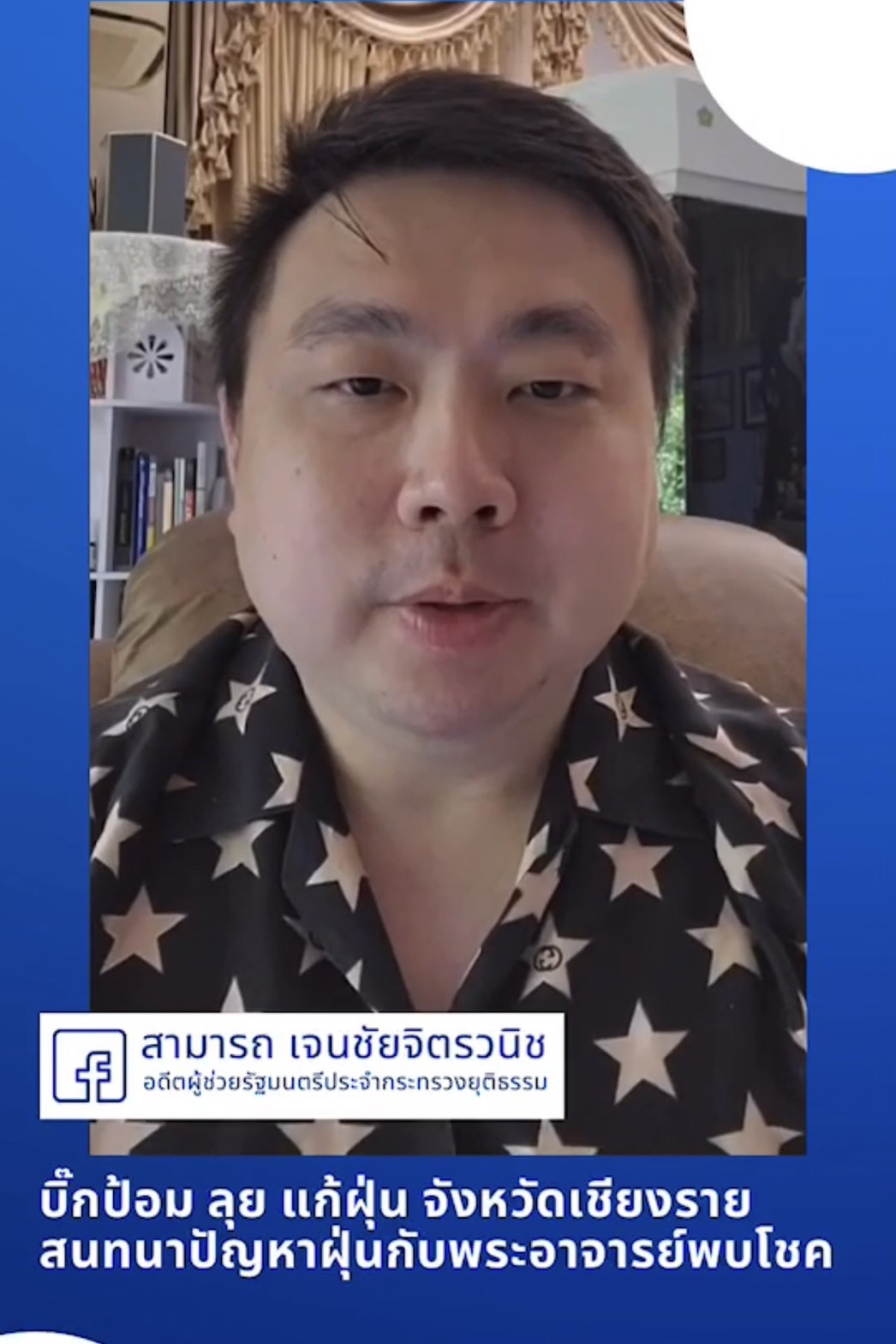นายสามารถ เจนชัยจิตรวนิช โฆษกประจำตัวหัวหน้าพรรคพลังประชารัฐ ได้ออกมาไลฟ์สดในรายการสามารถ 5 นาที ผ่านเฟซบุ้คส่วนตัว สามารถ เจนชัยจิตรวนิช โดยนายสามารถ ได้ออกมพูดถึงเรื่องปัญหาฝุ่น PM 2.5 ที่กำลังระบาดอยู่ในเวลานี้ หลายจังหวัดมีค่าฝุ่นขึ้นสูง ในเรื่องนี้ พล.อ.ประวิตร วงษ์สุวรรณ รองนายกรัฐมนตรี และ หัวหน้าพรรคพลังประชารัฐ ได้มีความเป็นห่วงพี่น้องประชาชน โดยให้ตนเองขึ้นไปเชียงรายเพื่อติดตามข้อมูลเรื่องดังกล่าว ซึ่งตนเองก็ได้ไปดูเห็นกับตาเพื่อให้เป็นนโยบายของหัวหน้าพรรคพลังประชารัฐกลั่นกลองมาเป็นนโยบายของพรรคต่อไป