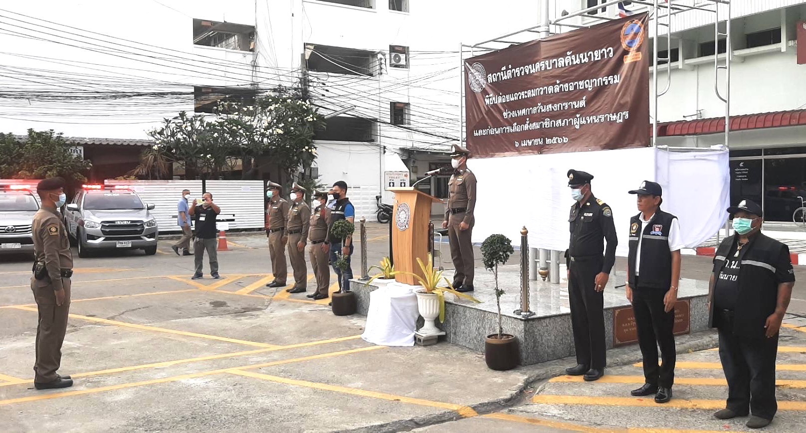 วันที่ 6 เมษายน 2566 เวลา 18.00 น.ที่บริเวณด้านหน้าเสาธงชาติ สน.คันนายาว พ.ต.อ.นเรนทร์ เครื่องสนุก ผกก.สน.คันนายาว เป็นประธานในพิธีปล่อยแถวระดมกวาดล้างอาชญากรรม ในห้วงเทศกาลสงกรานต์ และดูแลความเรียบร้อยในช่วงการหาเสียงเลือกตั้งสมาชิกสภาผู้แทนราษฎร. เพื่อเฝ้าระวัง ป้องปรามเหตุร้าย และการกระทำผิดกฎหมายเลือกตั้ง โดยมี พ.ต.ท.ยงค์ยุทธ ประเสริฐผล รอง ผกก.ป.สน.คันนายาว เป็นผู้กล่าวนำและต้อนรับ
