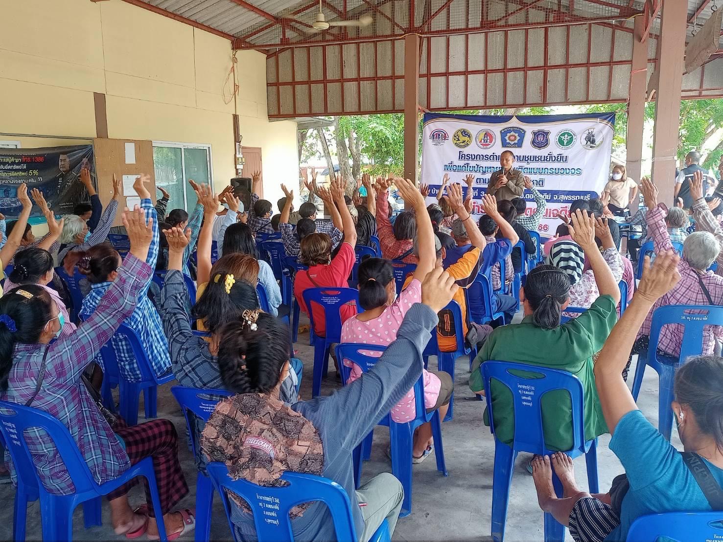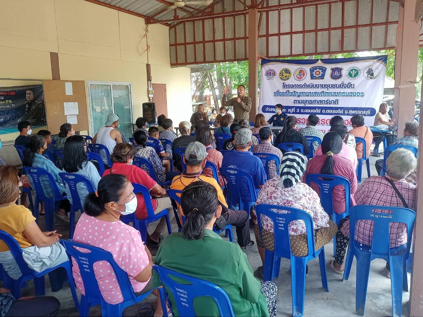 วันจันทร์ที่ 10 เมษายน พ.ศ.2566 เวลา 10.00 น. พ.ต.อ.เอกชัย ศรีเมือง ผกก.สภ.ดอนเจดีย์ เป็นประธานในกิจกรรมชุมชนยั่งยืนแก้ไขปัญหายาเสพติดแบบครบวงจรตามยุทธศาสตร์ชาติ ปี 2566 พร้อมเรียกประชุมเจ้าหน้าที่ตำรวจ หัวหน้าชุมชน ผู้ปกครองท้องถิ่น ที่ศาลาประชาคมหมู่บ้านหนองสระ หมู่ 3 ตำบลดอนเจดีย์ อำเภอดอนเจดีย์ จังหวัดสุพรรณบุรี เพื่อเตรียมการ X-RAY นำผู้เสพเข้ากิจกรรมบำบัดฟื้นฟู ตามโครงการชุมชนยั่งยืนฯ โดยมี พ.ต.ท.ณธกร เมธาพรเกษม รอง ผกก.ป.สภ.ดอนเจดีย์ / พ.ต.ต.ไชยา ประเสริฐ สวป.สภ.ดอนเจดีย์ / เจ้าหน้าที่ชุดปฏิบัติการชุมชนยั่งยืน สภ.ดอนเจดีย์ / นายณรงค์ฤทธิ์ รัชสุระ กำนันตำบลดอนเจดีย์ / นายกันตพัฒน์ เจตนเสน ปลัดอำเภอดอนเจดีย์ / นางธนพร เพ็ญสุต พัฒนาการอำเภอดอนเจดีย์ ร่วมกิจกรรมดังกล่าว