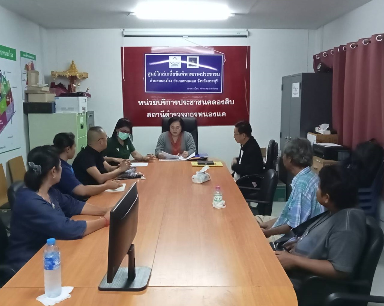 วันนี้ 30 เมษายน 2566 เวลา 10.00 น.ที่ศูนย์ไกล่เกลี่ยภาคประชาชนตำบลหนองโรง อ.หนองแค จ.สระบุรี ร.ต.อ.(ญ)พรชรินทร์ วรแสน รอง.สว.สอบสวน.สภ.หนองแซง / ร.ต.ท.มนัส ทองทับ ข้าราชการบำนาญ / นางศรีภัทรา ร่มพุดตาล ผอ.โรงพยาบาลส่งเสริมสุขภาพ ต.หนองโรง / นายประเสริฐ ม่วงจีบ ผู้ใหญ่บ้าน ม.5 ต.หนองโรง / นางศิริพร อัศวเกศมณี เลขานุการ นายก อบต.หนองโรง / ด.ต.สนธญา ฐิติโสภณ หัวหน้าสายตรวจคลองสิบ สภ.หนองแค ร่วมกันไกล่เกลี่ย ข้อพิพาทกรณีผู้ร้องทุกข์ มาร้องทุกข์ที่ศูนย์ไกล่เกลี่ยฯ เมื่อวันที่ 15 ต.ค.65 ที่ผ่านมา เพื่อให้คู่กรณีย้ายบ้านออกจากพื้นที่ผู้ร้องทุกข์ และจ่ายค่าสินไหมทดแทนให้กับคู่กรณี เป็นเงิน 30,000 บาท