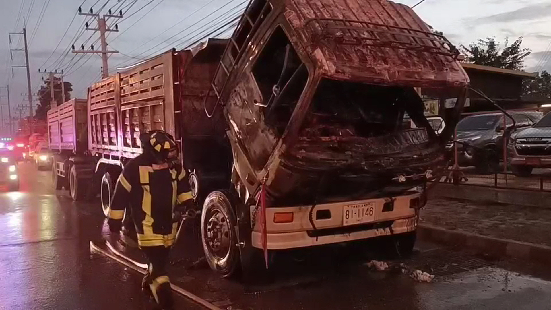 ทั้งนี้จากตรวจสอบทราบว่าผู้ที่ขับรถคันดังกล่าวชื่อ นายวีรวัชร์ มาฮวบ อายุ 23 ปี เปิดเผยว่าได้ขับรถยนต์พ่วงคันดังกล่าวออกมาจากบริษัทแห่งหนึ่งในตัวเมืองลพบุรีเพื่อที่จะไปรับหินที่ ต.หน้าพระลาน สระบุรี เมื่อมาถึงจุดดังกล่าวได้เกิดกลุ่มควันขึ้นที่ใต้คอนโซนห้องคนขับ และเกิดไฟลุกไหม้ขึ้น จึงได้พยายามขับรถเข้าข้างทางพยายามใช้น้ำที่มีอยู่ดับเพลิงก็ไม่สามารถดับได้ จากนั้นได้เปิดประตูวิ่งออกมาจากตัวรถได้ โดยมีพลเมืองดีขับรถผ่านมาแจ้งให้เจ้าหน้าที่ตำรวจ และขอการสนับสนุนรถดับเพลิงมาสกัดเพลิงที่รถดันดังกล่าวได้ทันเวลา ทราบว่ารถบรรทุกพ่วงได้มีการไปปรับแต่งสายไฟมาก่อนหน้านี้ ส่วนสาเหตุที่แน่ชัดต้องรถตำรวจพิสูจน์หลักฐานตรวจสอบอีกครั้ง