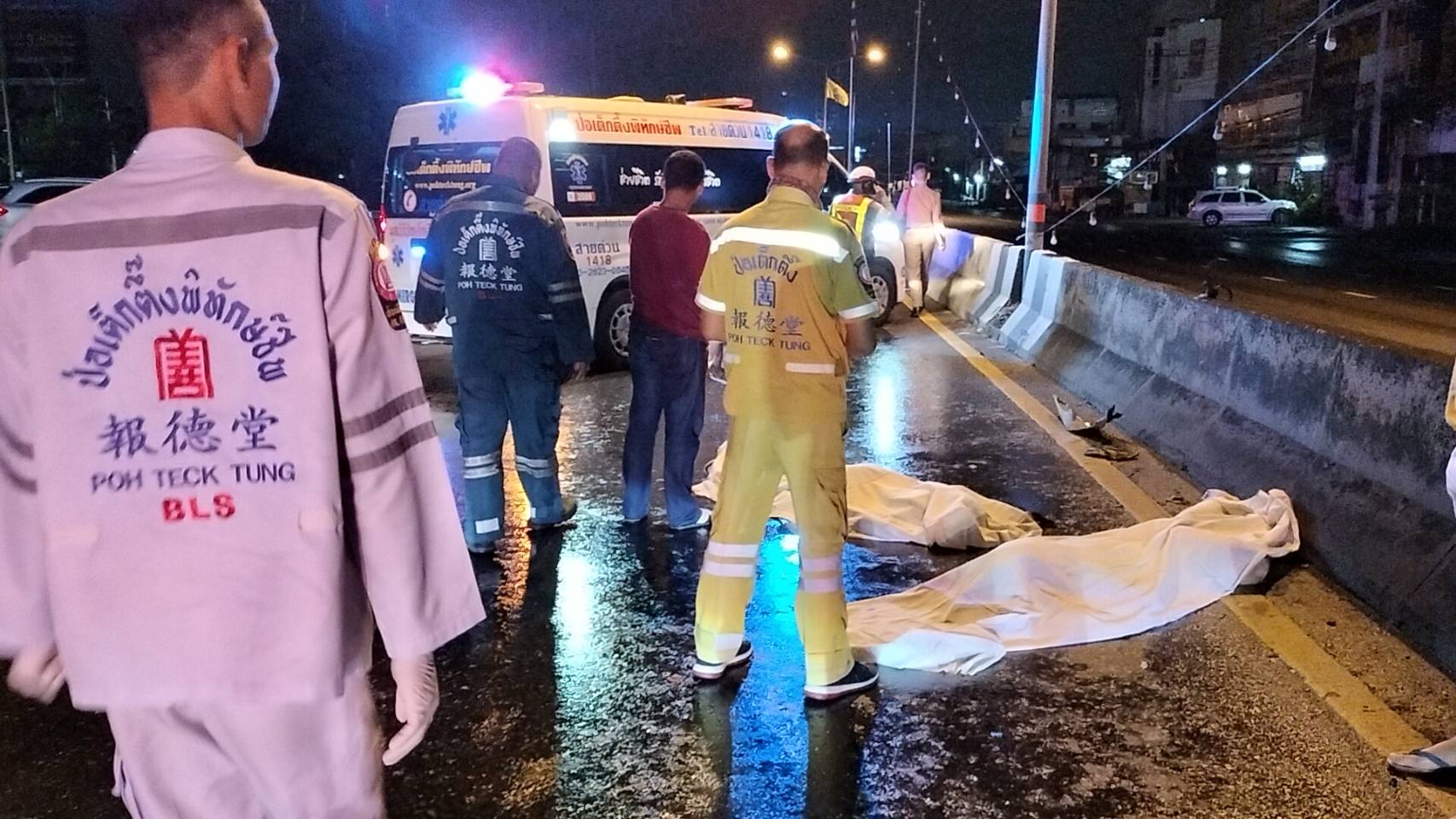ในที่เกิดเหตุบนถนนรังสิต-นครนายก ด้านขวาสุด เจ้าหน้าที่พบผู้เสียชีวิตเป็นชายทั้ง 2 ราย รายแรกทราบชื่อคือ นายธกุล พันธ์เพชร อายุ 19 ปี ชาวจังหวัดศรีสะเกษ สภาพศพแขนขาหัก เป็นนักศึกษาคณะนิเทศชั้นปีที่ 2 ของมหาวิทยาลัยนอร์ท และรายที่สองทราบชื่อคือ นายญารินดา แสนโสภา อายุ 19 ปี ชาวอำเภอบางปะอิน จังหวัดพระนครศรีอยุธยา สภาพศพถูกรถหกล้อทับร่าง จนแขน-ขาหัก และไส้ทะลัก เป็นนักศึกษาคณะนิเทศ ชั้นปีที่ 1 และห่างจากจุดพบศพ ประมาณ 100 เมตร เจ้าหน้าที่พบรถจักรยานยนต์ยี่ห้อ Honda สีเทาดำ หมายเลขทะเบียน 6ขภ-3602 กทม. สภาพรถพังยับเยิน ล้มอยู่ริมถนนด้านซ้าย ส่วนผู้บาดเจ็บทางเจ้าหน้าที่กู้ภัย ได้นำตัวส่งโรงพยาบาลบางประกอก2รังสิตไปก่อนหน้านี้ และทราบคือนายเอกรัตน์มโนภักดิ์ อายุ 21 ปี ชาวจังหวัดนราธิวาส ส่วนรถคู่กรณีหลบหนี