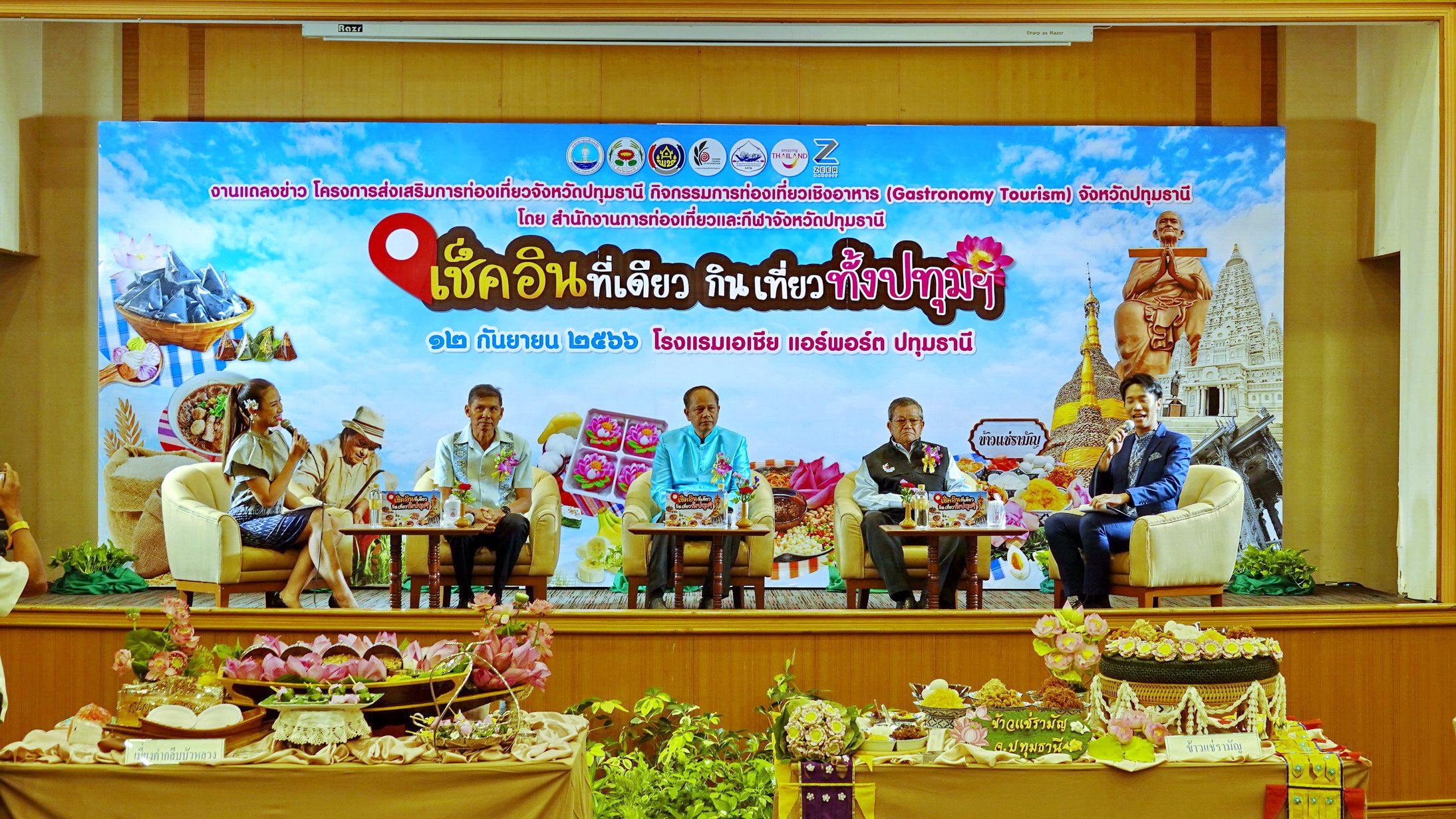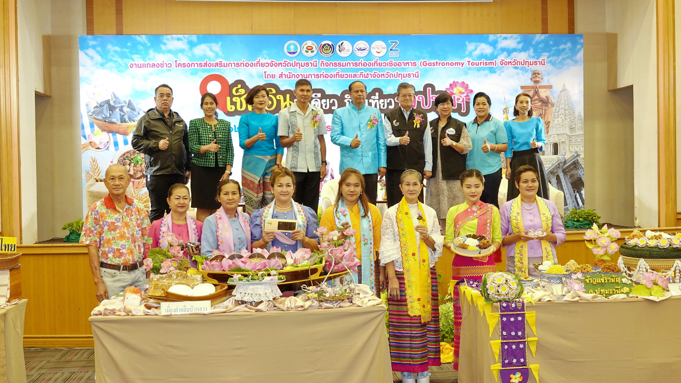 ที่ห้องอารีน่า โรงแรมเอเชีย แอร์พอร์ท เซียร์รังสิต ตำบลคูคต อำเภอลำลูกกา จังหวัดปทุมธานี นายสิทธิชัย สวัสดิ์แสน รองผู้ว่าราชการจังหวัดปทุมธานี , นายสุทัศน์ คงแย้ม ท่องเที่ยวและกีฬาจังหวัดปทุมธานี , นายปกรณ์พัฒน์ เทพเอื้อตระกูล รองนายกสมาคมส่งเสริมการค้าธุรกิจท่องเที่ยวปทุมธานี ร่วมแถลงข่าวงาน “เช็คอินที่เดียว กินเที่ยวทั้งปทุมฯ” เพื่อส่งเสริมการท่องเที่ยวเชิงอาหารของจังหวัดปทุมธานี