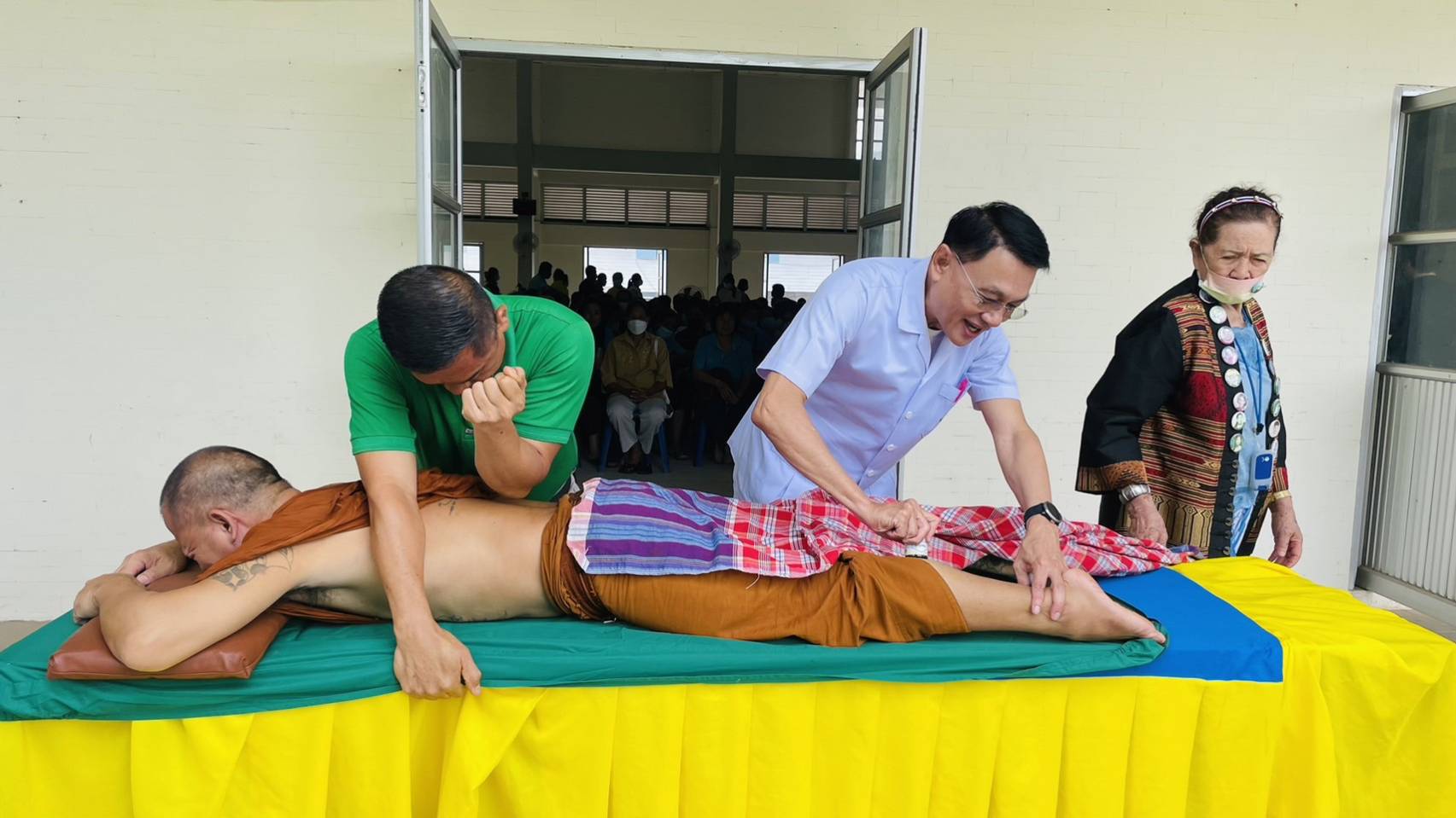 และต้องขอแสดงความยินดีแก่หมอพิมพ์พนิต หลวงปราบ หมอลัดดา ภควัตมงคล และ หมอโบ พลเอก อรรฐพร โบสุวรรณ ที่สอบใบประกอบโรคศิลป์ด้านเวชกรรม สภาการแพทย์แผนไทย ผ่านทุกท่าน เมื่อวันที่ 13 ก.ย.ที่ผ่านมา นับว่าเป็นมงคลวิถีอาชีพในวันแรกของการเป็นแพทย์แผน ที่ได้บำเพ็ญประโยชน์ให้แก่เพื่อนมนุษย์ นอกจากนี้ พระเอกโอ๊ด สุรศักดิ์ และแม่หมอ สายใย ปรมาจารย์ในการนวดผู้สืบทอดวิชาการนวดจากบรรพบุรุษที่เก่งกาจในสมัยต้นกรุงรัตนโกสินทร์ท่านทั้งสองก็ปฏิบัติงานอย่างเหน็ดเหนื่อย เต็มกำลัง ซึ่งทั้งหมดนี้ผู้สนับสนุนทุนดำเนินงานและคณะแพทย์แผนไทยสัญจรทุกคนได้จัดทำเป็นกิจกรรมดังกล่าวถวายเป็นพระราชกุศลแด่สมเด็จพระนางเจ้าสิริกิติ์ พระบรมราชินีนาถ พระบรมราชชนนีพันปีหลวง ขอทรงมีพระพลานมัยแข็งแรงพระชนมายุยิ่งยืนนาน