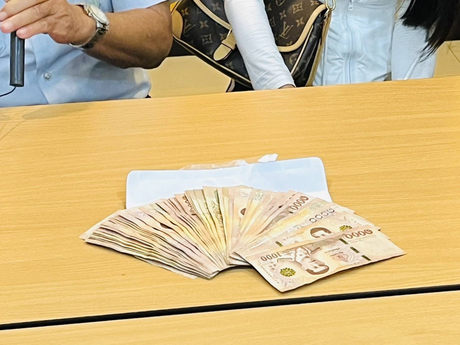 ตกกระจายอยู่เบาะหลัง ไม่มีเอกสาร จึงนำเงินใส่ถุงกระดาษ จำนวน 52,000 บาท ตอนแรกผู้โดยสารช่วยโทรถามทางโรงแรม ยังไม่มีการแจ้งลืมของ ส่วนตนเองโทรแจ้ง สวพ.FM91 และนำมาฝากไว้ให้ช่วยประกาศตามหาเจ้าของ