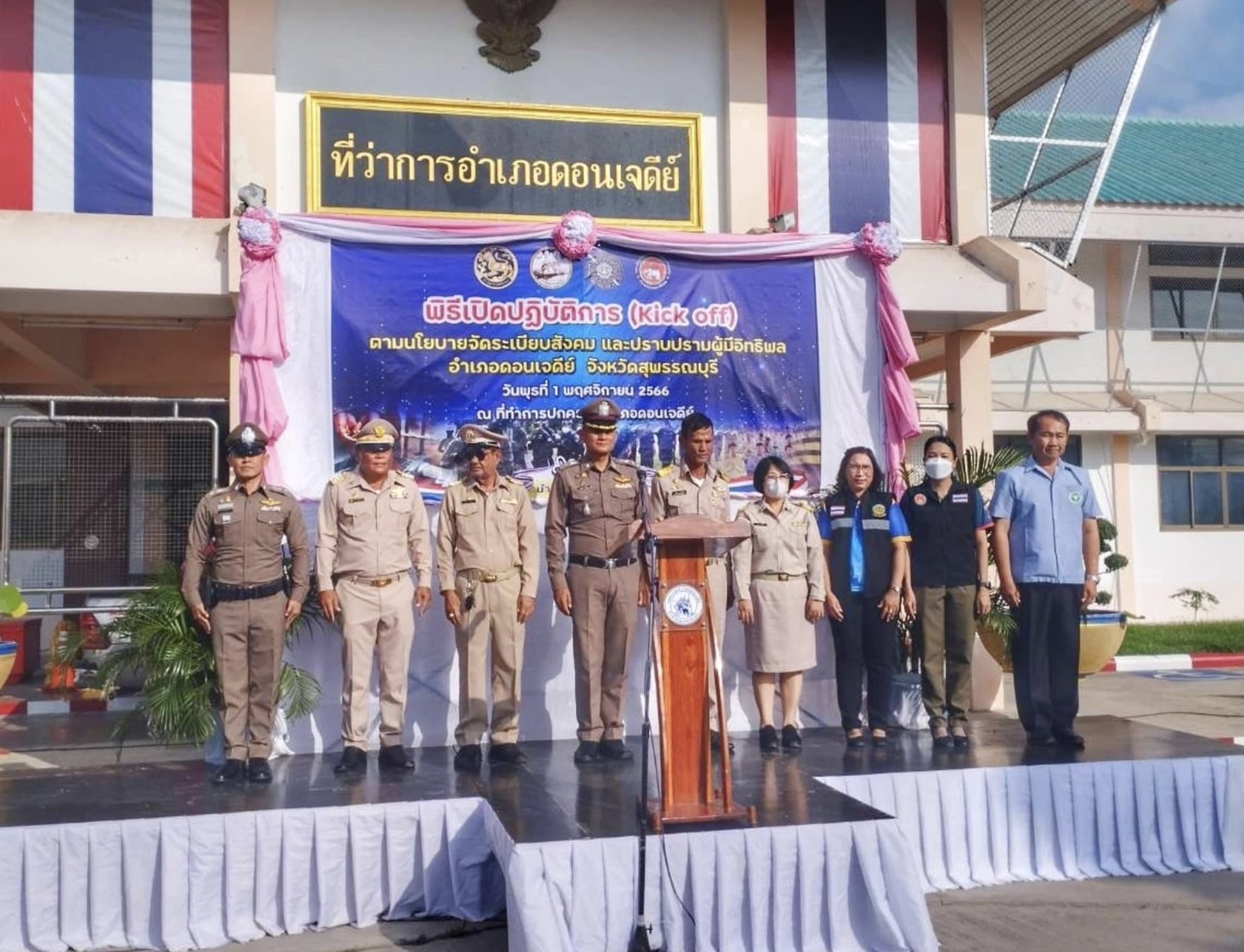วันที่ 1 พ.ย.66 เวลา 16.00 น.ณ หน้าที่ว่าการ อ.ดอนเจดีย์ จว.สุพรรณบุรี พ.ต.อ.เอกชัย ศรีเมือง ผกก.สภ.ดอนเจดีย์ พร้อมด้วย พ.ต.ท.ณธกร เมเธาพรเกษม รอง ผกก.ป.สภ.ดอนเจดีย์ เจ้าหน้าที่ตำรวจ สภ.ดอนเจดีย์ ร่วมพิธีเปิดปฏิบัติการ (Kick off) ตามนโยบายจัดระเบียบสังคมและปราบปรามผู้มีอิทธิพล บูรณาการความร่วมมือส่วนราชการที่เกี่ยวข้องจากหลายหน่วยงานในพื้นที่ โดยมี นายบุญฤทธิ เยี่ยมยอด นายอำเภอดอนเจดีย์เป็นประธาน