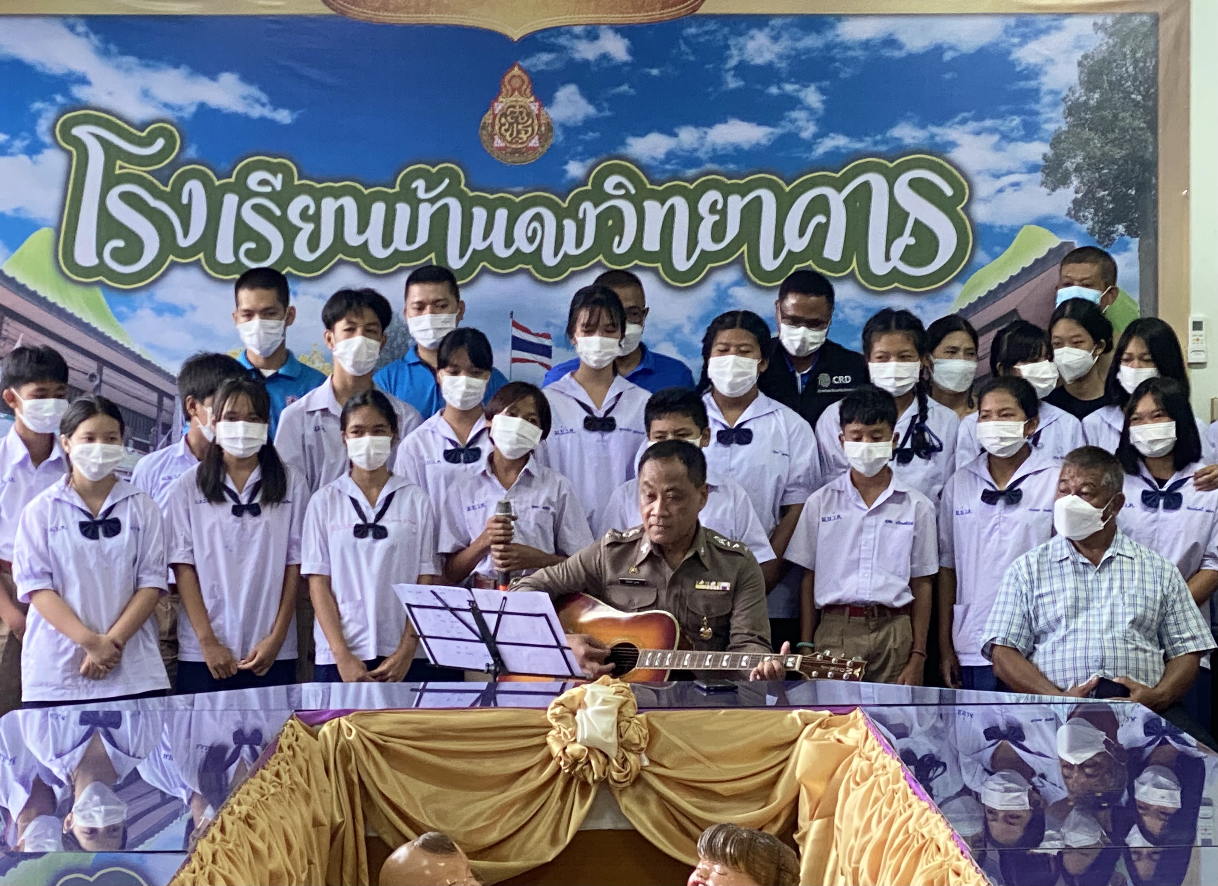 นอกจากนี้ ทาง พ.ต.อ.ชัยวัฒน์ ได้ทำการร่วมเล่นกีตาร์ร้องเพลงจากนี้เราจะเดินเคียงกันร่วมกับเด็กนักเรียน ซึ่งเพลงดังกล่าวเป็นเพลงที่ พ.ต.อ.ชัยวัฒน์ ได้แต่งขึ้นเป็นการร่วมแรงใจระหว่างภาคตำรวจและ ประชาชน ก่อนนำนักเรียนเข้าห้องสอนวิธีการสเก็ตภาพเพื่อจดจำหน้าคนร้ายเบื้องต้น หลังเสร็จสิ้นการสอนวิธีสเก็ตภาพ นายสุราช หงษ์ทอง ผอ.โรงเรียนได้เป็นตัวแทนคณะครู มอบของที่ระลึกให้กับเจ้าหน้าที่ที่มาทำกิจกรรม ก่อนที่ทาง พ.ต.อ.ชัยวัฒน์ ได้นำมอบสิ่งของ เครื่องกีฬาให้กับโรงเรียนบ้านดง และร่วมเตะฟุตบอล ระหว่าง ทีมนักเรียนกับทีม เจ้าหน้าที่ ฝทว. 2 พร้อมร่วมรับประทานอาหารกลางวันด้วยกัน