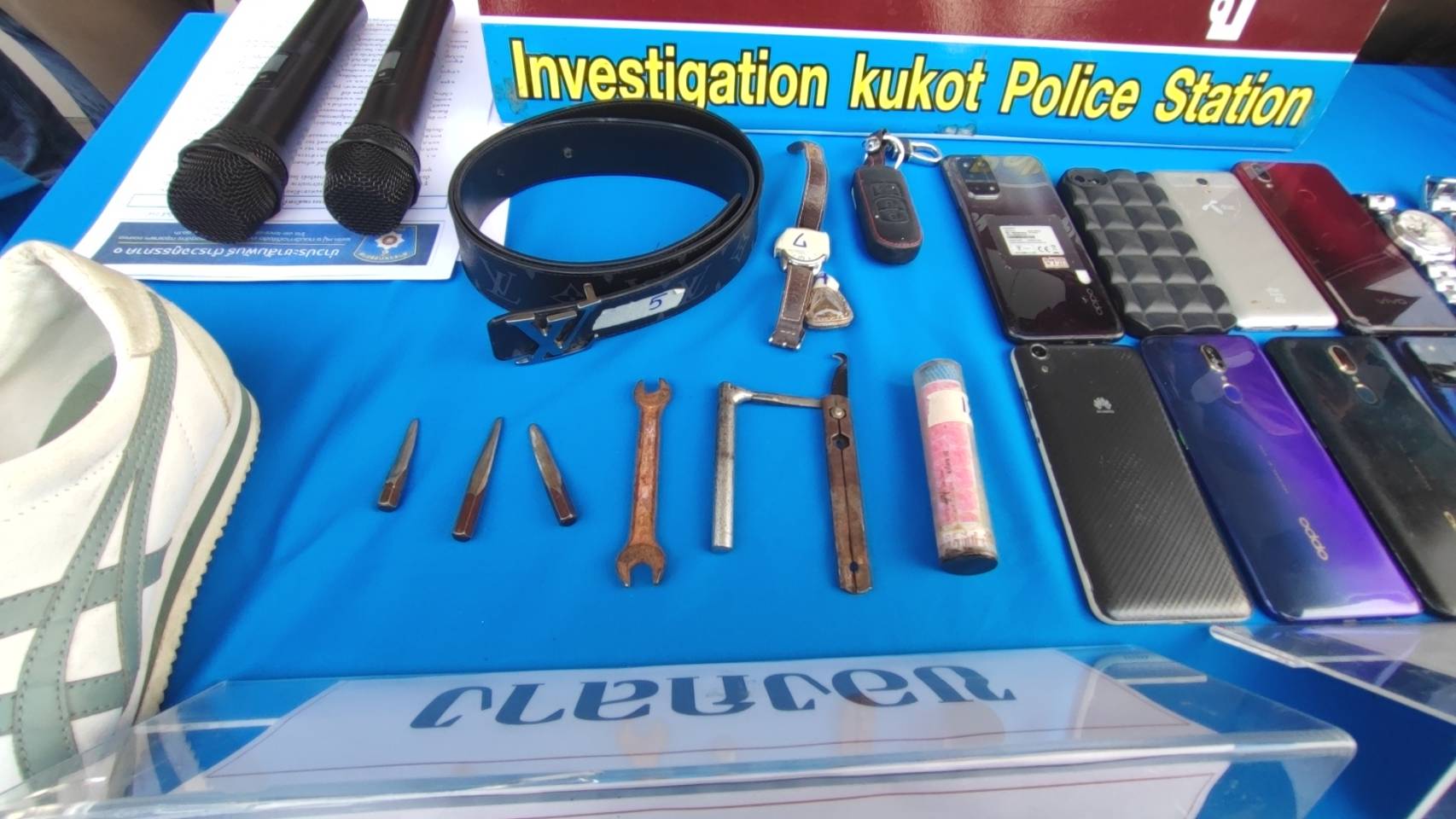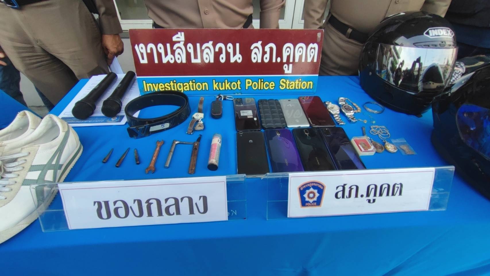 พล.ต.ต.ยุทธนา จอนขุน ผบก.จ.ปทุมธานี พ.ต.อ.วิษณุรักษ์ พรหมเมศร์ รองผบก.จ.ปทุมธานี รักษาราชการแทนผกก.สภ.คลองหลวง พ.ต.อ.กานตภณ วรรณา ผกก.สภ.คูคต พ.ต.ท.สิรภพ บัวหลวง สารวัตรสืบสวน (หน.ชุด ศปจร.สภ.คลองหลวง),พร้อมด้วยเจ้าหน้าที่ตำรวจสืบสวน สภ.คูคต เจ้าหน้าที่ตำรวจสืบสวน สภ.คลองหลวง พ.ต.ต.มนตรี คงอาจ สวป.สภ.คลองหลวง พร้อมเจ้าหน้าที่ชุดจับกุม ได้ร่วมกันแถลงข่าวจับกุมคนร้ายลักทรัพย์ 3 คดีใน 3 พื้นที่ ลักรถยนต์และลักรถจักรยานยนต์ได้ของกลางรถจักรยานยนต์จำนวน 5 คัน รถยนต์ยี่ห้อนิสันหมายเลขทะเบียน วบ 9597 กรุงเทพมหานคร จำนวน 1 คัน พร้อมทั้งอุปกรณ์ที่ใช้ในการก่อเหตุลักรถจักรยานยนต์