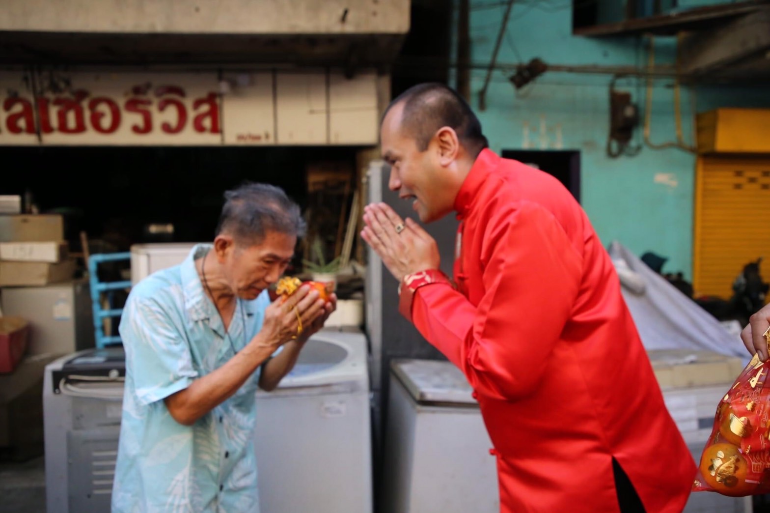 สำหรับการมอบส้มมงคล ผลไม้แห่งความโชคดีและมั่งคั่งร่ำรวยของชาวจีนให้แก่บรรดาพ่อค้าแม่ค้า และประชาชน ถือเป็นธรรมเนียมที่ปฏิบัติกันมาอย่างยาวนาน สำหรับการ “ไป๊เจีย” หมายถึงการไหว้ขอพรแก่ผู้ใหญ่ที่เคารพนับถือด้วยการนำส้มไปมอบให้ เหตุผลที่ต้องเป็น “ส้ม” ก็เพราะว่าส้มเป็นผลไม้สิริมงคล มีสีผิวเหลืองเหมือนทอง และคำว่าส้มในภาษาจีน มีความหมายว่า ความสุข หรือ โชคลาภ ฉะนั้นการนำส้มไปให้ก็เปรียบเสมือนการนำความสุข โชคลาภไปให้นั่นเอง โดยการมอบส้ม ได้แบ่งออกเป็น 2 เส้นทาง คือ