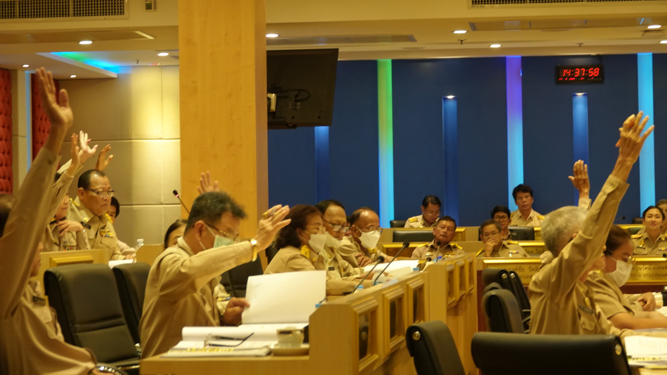 นายชั้น รักสูงเนิน สท.เขต4 นครรังสิต กล่าวว่า ผมขอสนับสนุนของใหม่ ท่านนายกฯได้เล็งเห็นแล้ว ส่วนที่ท่านนำเสนอมีประโยชน์ต่อประชาชนในพื้นที่นครรังสิต เช่น โครงการกล้องวงจรปิดเมื่อมีขโมยมาจากพื้นที่อื่นก็จะมองเห็นภาพที่ชัดเจนจากไฟฟ้าส่องสว่าง LED ท่านนายกฯได้เล็งเห็นแล้วว่าเป็นประโยชน์ ทำไมคนรังสิตถึงจะไม่ยอมรับโครงการดี ๆ โครงการที่เป็นประโยชน์ต่อทุกท่านเอง ผมว่าโครงการที่เสนอวันนี้ก็ตกอีกแหละ อย่างไรก็ตก อย่างนี้ตกแน่นอน โดยเฉพาะเรื่องไม่ผ่านเกี่ยวข้องกับการยกระดับระบบสาธารณูปโภคใหม่นครรังสิต ทั้งเรื่อง การติดตั้งกล้องวงจรปิดระบบใหม่ ไฟฟ้าส่องสว่างLED ฝาท่อเหล็กมาตรฐานที่ทนและง่ายต่อการใช้งาน