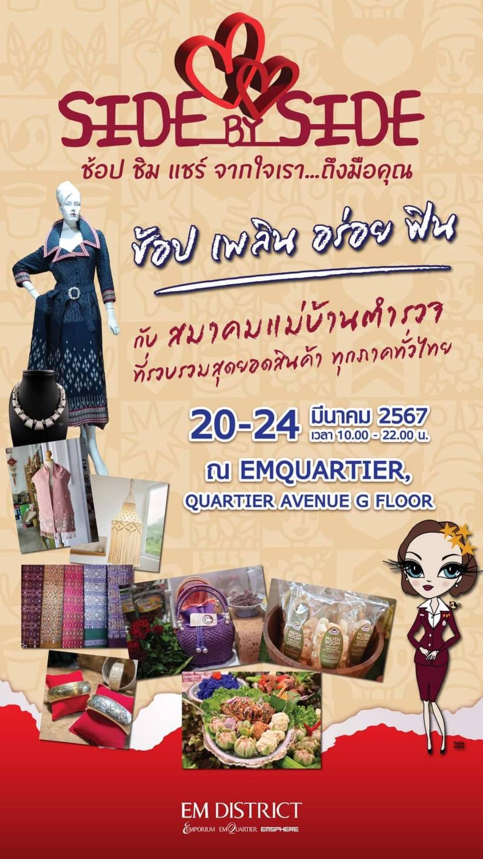 สำหรับผู้ที่สนใจสามารถมาร่วมงาน “Side by Side ช้อป ชิม แชร์ จากใจเรา…ถึงมือคุณ” สามารถมาร่วมงานได้โดยไม่มีค่าใช้จ่าย ได้ตั้งแต่ในวันที่ 20 – 24 มีนาคม 2567 เวลา 10.00-21.00 น. ณ ลาน Quartier Avenue ชั้น G ศูนย์การค้าเอ็มควอเทียร์