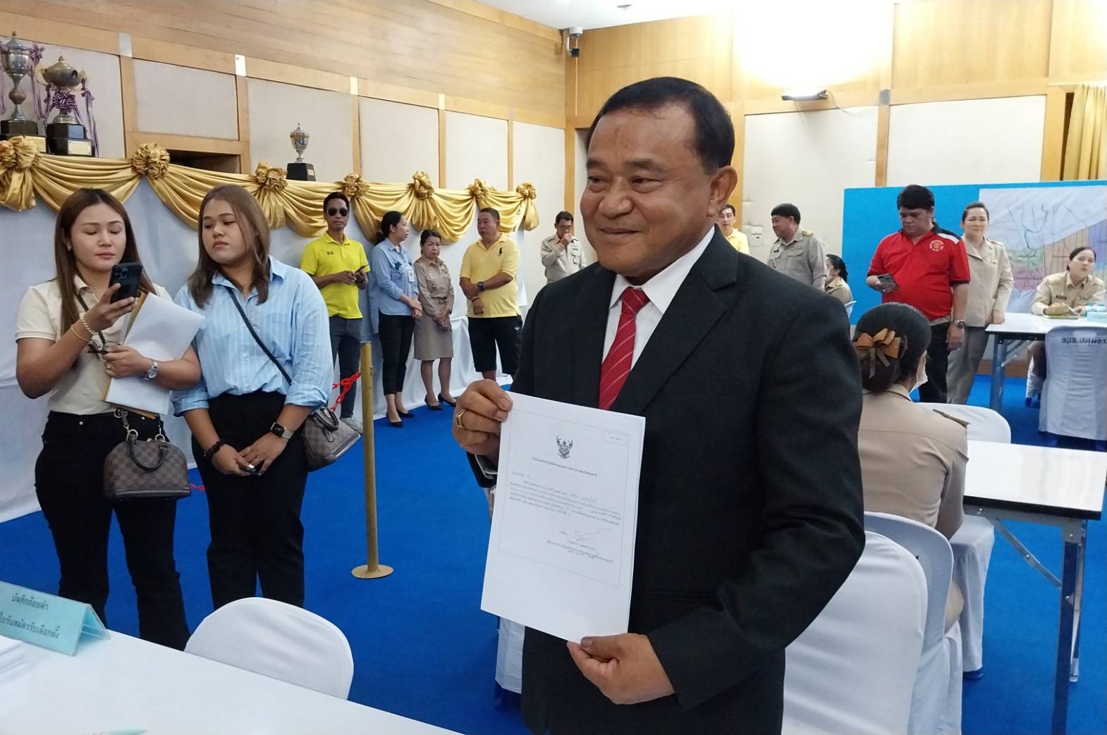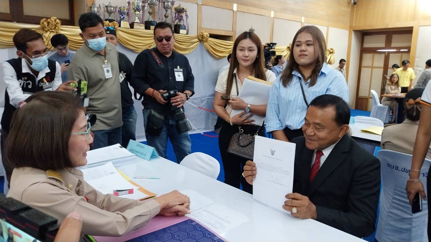 บรรยากาศในการรับสมัครชิงตำแหน่งนายก อบจ.ปทุมธานี ซึ่งมีนายยุทธนา แสงพงศานนท์ ปลัดองค์การบริหารส่วนจังหวัดปทุมธานี ในฐานะผู้อำนวยการการเลือกตั้งของวันแรก มี นายชาญ พวงเพชร์ อดีตนายกองค์กรบริหารส่วนจังหวัดปทุมานี 3 สมัย มาลงชื่อก่อนเวลารับสมัครเพียงคนเดียว จึงได้เบอร์ 1 ในการลงเลือกตั้งตำแหน่งนายก อบจ.ปทุมธานี และมี นายสรวงศ์ เทียนทอง สส.สระแก้ว เลขาธิการพรรคเพื่อไทย และทีมงานพรรคเพื่อไทย , นายมนัสนันท์ หลีนวรัตน์ (ส.ส.ฟลุ๊ค) ส.ส. เขต5 ปทุมธานี พรรคเพื่อไทยคนปัจจุบัน , นายสุรพงษ์ อึ้งอัมพรวิไล ที่ปรึกษารัฐมนตรีช่วยว่าการกระทรวงคมนาคม อดีต ส.ส.พรรคเพื่อไทย , นายเสวก ประเสริฐสุข อดีตรองนายก อบจ.ปทุมฯ (สมัยนายกฯแจ๊ส) , นายธนศักดิ์ (เล็ก รูปหล่อ) แป้นมุข และ นายณเรศ คุชิตา อดีตที่ปรึกษา พล.ต.ท.คำรณวิทย์ ธูปกระจ่าง รวมทั้ง FC ของคนเสื้อแดงร่วมมอบพวงมาลัยดอกไม้ให้กำลังใจลุงชาญกว่า 150 คน