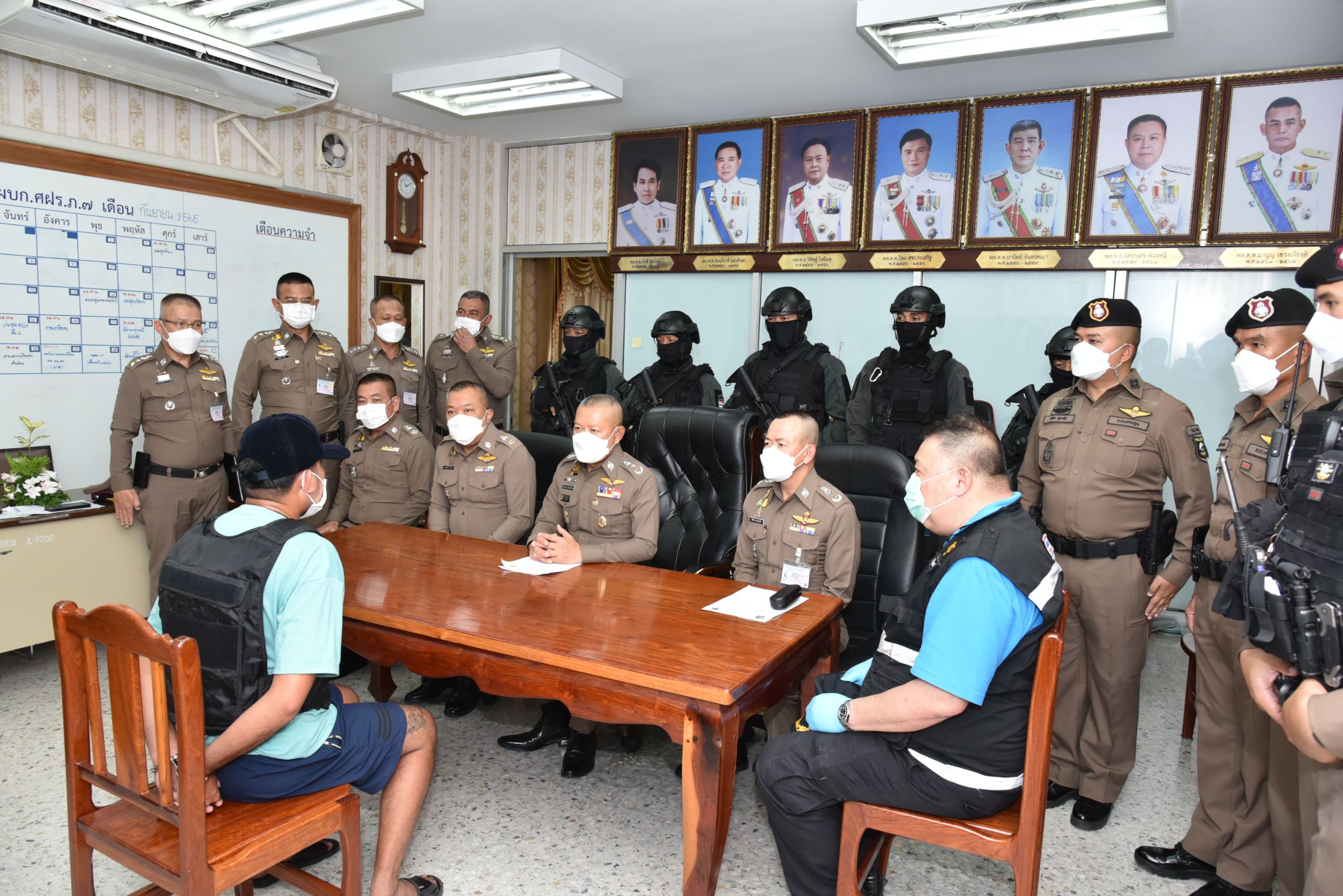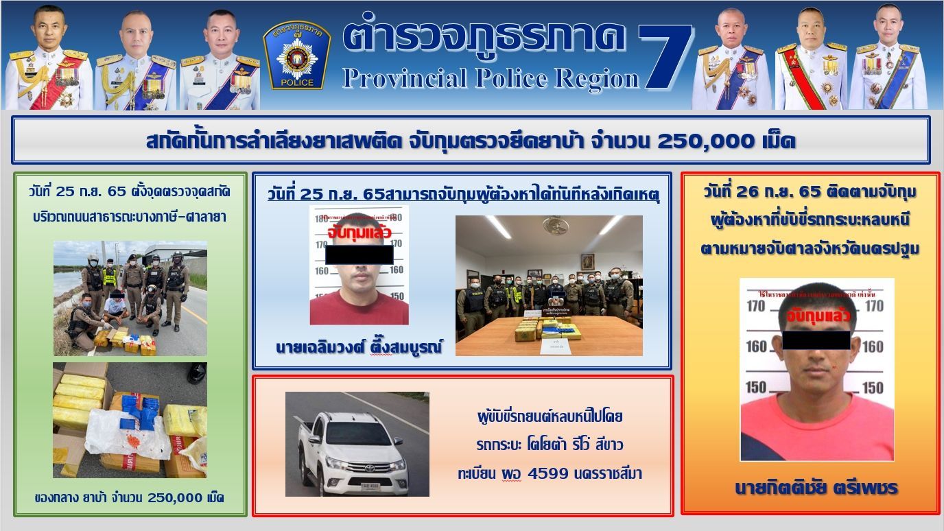 วันนี้ วันอังคารที่ 27 ก.ย. 65 เวลา 13.30 น. ณ ตำรวจภูธรภาค7 ต.พระปฐมเจดีย์ อ.เมืองนครปฐม จว.นครปฐม พล.ต.ท.ธนายุตม์ วุฒิจรัสธำรงค์ ผบช.ภ.7 พร้อมด้วย พล.ต.ต.บุญญฤทธิ์ รอดมา รอง ผบช.ภ.7 พล.ต.ต.ชมชวิณ ปุระธนานนท์ ผบก.ภ.จว.นครปฐม พล.ต.ต.ปรีดา อิ่มเจริญ ผบก.ศฝร.ภ.7/หน.ชปส.ภ.7 พ.ต.อ.สธนทัต ตั้งสิทธิ์เสรีวงศ์ รอง ผบก.ภ.จว.นครปฐม พ.ต.อ.พงษ์สวัสดิ์ คำปาเชื้อ รอง ผบก.ภ.จว.นครปฐม พ.ต.อ.ศุภชัย ไตรสมบูรณ์ นวท.(สบ.5) ศพฐ.7 พ.ต.ท.อุทัย สุมาลัย รอง ผกก.ป.สภ.บางเลน รรท.ผกก.สภ.บางเลน และเจ้าหน้าที่ที่เกี่ยวข้อง ร่วมแถลงผลจับกุม นายเฉลิมวงศ์ หรือหนึ่ง ตึ๊งสมบูรณ์ อายุ 33 ปี นายกิตติชัย หรือตี๋ ตรีเพชร อายุ 32 ปี ผู้ต้องหาตามหมายจับศาลจังหวัดนครปฐม ที่ จ.352/2565 พร้อมด้วยของกลาง 1.ยาเสพติดให้โทษประเภท 1 (ยาบ้า) ชนิดเม็ดกลมแบน สีแดงส้ม ด้านหนึ่งผิวเรียบ ด้านหนึ่งมีตัวอักษร WY บรรจุอยู่ในถุงพลาสติกสีฟ้า มัดด้วยหนังยาง จํานวน 10 ถุง พันทับด้วยกระดาษสาสีขาว จำนวน 125 มัด (250,000เม็ด) รวมยาบ้าจำนวนทั้งสิ้น 250,000เม็ด 2.โทรศัพท์มือถือ ยี่ห้อ ออปโป้ (OPPO) รุ่น A16 ระบบ 2 ซิมการ์ด หมายเลข IMEI (ช่องซิม 1) 868362062354779 หมายเลข IMEI (ช่องซิม 2) 868362062354761 หมายเลขโทรศัพท์ 093-7102405 ระบบ (AIS) จํานวน 1 เครื่อง 3.เงินสด จำนวน 300,000 บาท 4.รถยนต์กระบะ ยี่ห้อโตโยต้า รุ่นรีโว่ สีขาว หมายเลขทะเบียน ผอ 4599 นครราชสีมา โดยตั้งข้อหาว่า “ร่วมกันจำหน่ายโดยมียาเสพติดให้โทษประเภทที่ 1 เมทแอมเฟตามีน (ยาบ้า) ไว้ในครอบครองเพื่อจำหน่าย อันเป็นการกระทำเพื่อการค้าก่อให้เกิดการแพร่กระจายในกลุ่มประชาชน”