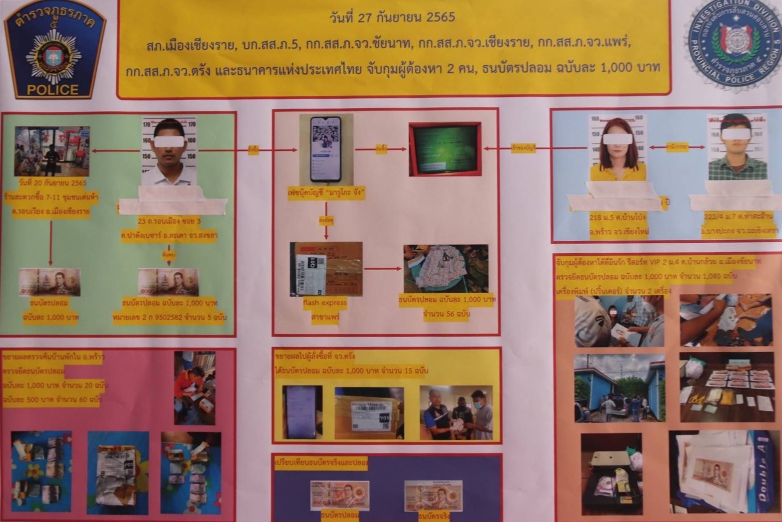 โดยคดีแรก เจ้าหน้าที่ชุดจับกุมจากสภ.เมืองเชียงราย จว.เชียงราย, บก.สส.ภ.5, กก.สส.ภ.จว.แพร่, กก.สส.ภ.จว.ชัยนาท สามารถจับกุม 1. น.ส.ธันวาภรณ์ (สงวนนามสกุล) อายุ 34 ปี เป็นชาว อ.พร้าว จว.เชียงใหม่ 2. นายพชร (สงวนนามสกุล) อายุ 29 ปี เป็นชาว อ.บางปะกง จว.ฉะเชิงเทรา 3. นายอับดุลมานาฟ (สงวนนามสกุล) อายุ 25 ปี เป็นชาว อ.สะเดา จว.สงขลา พร้อมของกลางธนบัตรปลอม ฉบับละ 1,000 บาท จำนวน 1,139 ฉบับ รวมมูลค่า 1,139,000 บาท / ธนบัตรปลอม ฉบับละ 500 บาท จำนวน 60 ฉบับ รวมมูลค่า 30,000 บาท / เครื่องพิมพ์ (ปริ้นเตอร์) จำนวน 2 เครื่อง / รถยนต์นั่งส่วนบุคคล ยี่ห้อฮอนด้า สีเทา หมายเลขทะเบียน งน 16XX เชียงใหม่ พร้อมแจ้งข้อกล่าวหา “ร่วมกันมีเพื่อนำออกใช้ซึ่งสิ่งใดๆ อันตนรู้ว่าเป็นธนบัตรของปลอมหรือเป็นธนบัตรปลอม” ซึ่งสามารถจับกุมได้ที่ รีสอร์ทแห่งหนึ่งใน อ.เมืองชัยนาท จว.ชัยนาท
