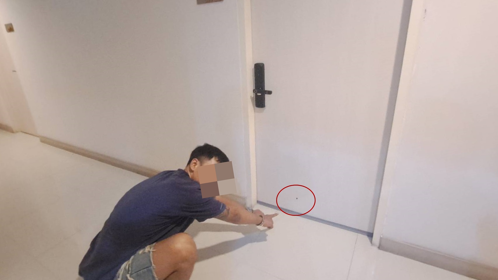 เจ้าหน้าที่ตำรวจ จึงได้วางแผนนำกำลังขึ้นตรวจสอบห้องที่เกิดเหตุ ทราบว่าเป็นห้องเลขที่ 57/12 ชั้น 2 เนื่องจากผู้ก่อเหตุมีอาวุธปืน จึงได้เตรียมกำลังพลใส่ชุดเกราะและโล่ห์รวมถึงอุปกรณ์สำหรับยับยั้งเหตุคนคุ้มคลั่ง จึงได้ไปตรวจสอบสวบห้องของผู้เสียหาย พบรอยกระสุนปืนที่บริเวณด้านล่างประตูเข้าห้อง ภายในห้องพบหัวกระสุน ขนาด 9 มม.ตกอยู่ที่พื้นและมีเศษไม้จากขาโต๊ะที่โดนกระสุน ก่อนให้เจ้าหน้าที่ตรวจสอบสิ่งแปลกปลอมให้ทั่ว หลังจากนั้นได้นำกำลังไปยังห้องก่อเหตุ ซึ่งมีรอยกระสุนบริเวณประตูด้านล่างรูตาแมว โดยเจ้าหน้าที่นิติบุคคลได้ทำการเคาะประตูเรียกคนที่อยู่ในห้องก่อเหตุ ได้มี น.ส.จิราวดี อายุ 29 ปี มาเปิดประตู พร้อมให้การว่าผู้ก่อเหตุคือ นายกฤษฎา อายุ 26 ปี แฟนของตนเอง ก่อนเกิดเหตุตนเองและแฟนหนุ่มได้ทะเลาะกันอย่างหนัก ก่อนที่แฟนของตนจะทำปืนลั่นอยู่ภายในห้อง แต่ตอนนี้ได้นำปืนกระบอกดังกล่าวออกไปแล้ว
