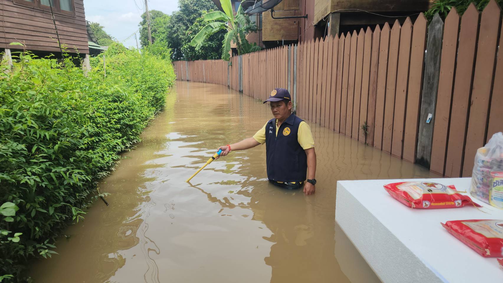 โดย พล.ต.ท.คำรณวิทย์ ธูปกระจ่าง นายก อบจ.ปทุมธานี กล่าวว่า เนื่องจากสถานการณ์น้ำเอ่อล้นริมแม่น้ำเจ้าพระยาจะเข้าท่วมขังบริเวณที่อยู่อาศัยและบ้านเรือนของประชาชนที่อยู่นอกคันกั้นน้ำ เราจึงได้มอบแพโฟมให้ เพื่อให้สามารถขนย้ายสิ่งของได้ แม้แต่ตู้เย็นก็สามารถวางได้ รถจักรยานยนต์ก็สามารถนำมาไว้บนโฟมเพื่อให้ลอยขึ้น ซึ่งพี่น้องประชาชนได้ร้องขอมาเยอะจึงรีบดำเนินการ รวมถึงได้ประสานงานกับเทศบาลท้องถิ่นที่อยู่ริมแม่น้ำ ให้รีบมารับเพื่อนำไปมอบให้พี่น้องประชาชนที่เดือดร้อน เพราะว่าเราเห็นว่าแพโฟมมีประโยชน์ต่อพี่น้องประชาชนจริง ๆ พร้อมทั้ง จัดหาเครื่องตรวจ ไฟรั่ว จากทางสถาบันเทคโนโลยีพระจอมเกล้าเจ้าคุณทหารลาดกระบัง เพื่อแจกจายให้กับ อปท. และ ประชาชนที่ถูกน้ำท่วม พร้อมฝากแจ้งประชาชนที่ใช้เรือสัญจรในแม่น้ำเจ้าพระยา ให้งดใช้ความเร็วเนื่องจากคลื่อนที่เกิดขึ้นอาจจะไปกระทบกับ ประชาชน และ กระสอบทรายที่กั้นน้ำอยู่ได้ และอยากให้ อปท.ที่มีพื้นที่ติดกับปม่น้ำเจ้าพระยา ช่วยกันดูและเรื่อง สิ่งกีดขวางการระบายน้ำ อาทิ ขยะ ผักตบชวา เป็นต้น ทางด้านสถานการณ์น้ำเราก็เฝ้าระวังอย่างใกล้ชิด โดนทาง นายนพพร ขาวขำ รองนายก อบจ.ปทุมธานี และ ร.ต.อ.ตรีลุพธ์ ธูปกระจ่าง นายกเทศมนตรีนครรังสิต ได้เฝ้าติดตามมวลน้ำด้วยดาวเทียม ซึ่งทำให้เราทราบว่าจะมีมวลน้ำฝนจาทางเหนือไหลเข้าสู้จังหวัดปทุมธานี อีกจำนวนมาก โดยเฉพาะ ช่วงวันที่ 8-13 ตุลาคมนี้ นอกจากนี้ยังเฝ้าจับตาการระบายน้ำของเขื่อนเจ้าพระยาอย่างต่อเนื่อง เมื่อวานมีการปลอยน้ำจากเขื่อนเจ้าพระยา กว่า 2,700 ลูกบาศก์เมตรต่อวินาที แต่วันนี้ ปรับลดลง เหลือ 2,400 ลูกบาศก์เมตรต่อวินาที อย่างไรก็ดีเรายังคงต้องเฝ้าติดตามเรื่องน้ำอย่างใกล้ชิด