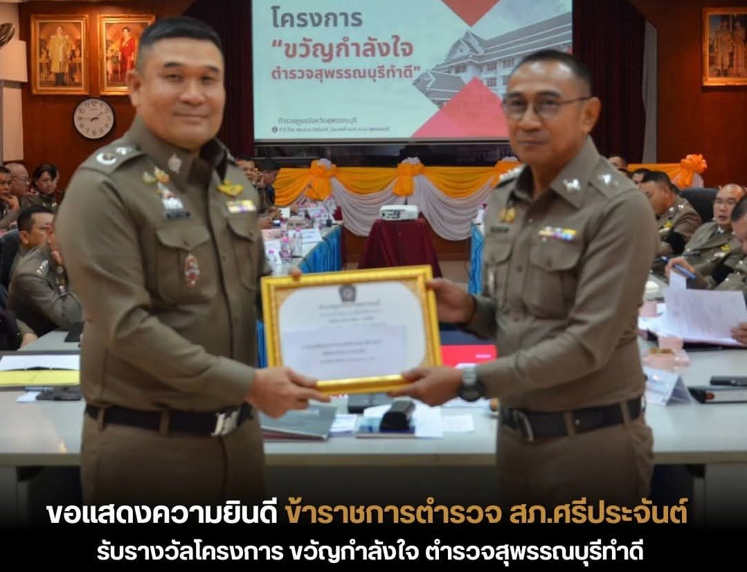 ทั้งนี้ พ.ต.อ.เอกชัย ศรีเมือง ผกก.สภ.ศรีประจันต์ ได้นำข้าราชการตำรวจ สภ.ศรีประจันต์ สายงานป้องกันปราบปราม และงานสืบสวน สภ.ศรีประจันต์ ได้รับรางวัลโครงการ ขวัญกำลังใจ ตำรวจสุพรรณบุรีทำดี ด้านการจับกุมคดีที่น่าสนใจ ร่วมรับรางวัล นำโดย พ.ต.ท.สุเทพ พิกุลขาว รอง ผกก.ป.ฯ พ.ต.ท.อดิเรก ขุนจันดี รอง ผกก.สส.ฯ