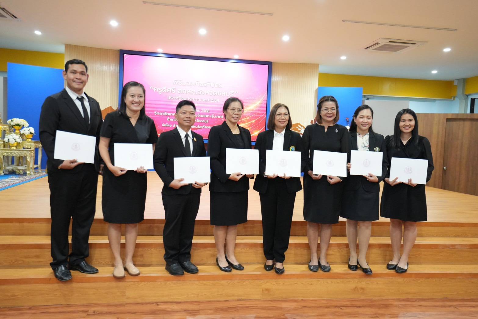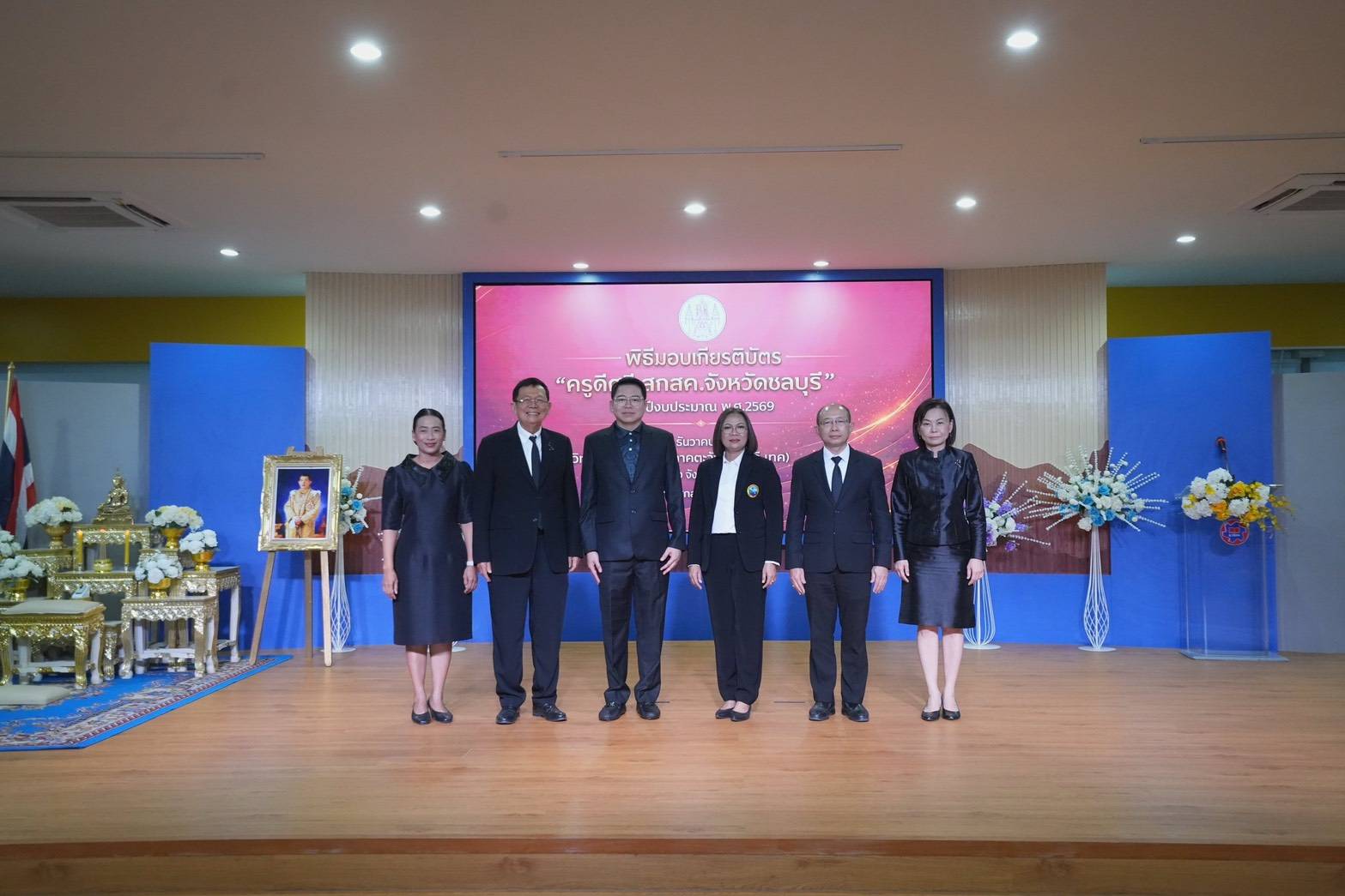 สำนักงานคณะกรรมการส่งเสริมสวัสดิการและสวัสดิภาพครูและบุคลากรทางการศึกษา (สกสค.) จัดพิธีมอบเกียรติบัตรรางวัล “ครูดีศรี สกสค. จังหวัดชลบุรี” ประจำปีงบประมาณ พ.ศ. 2569 โดยมี ดร.พีระพันธ์ เหมะรัต เลขาธิการคณะกรรมการ สกสค. เป็นประธานในพิธี มอบเกียรติบัตรแก่ครูและบุคลากรทางการศึกษา พร้อมด้วยผู้บริหารด้านการศึกษา และพนักงานเจ้าหน้าที่สำนักงาน สกสค. จังหวัดชลบุรี เข้าร่วมพิธี เมื่อวันที่ 21 ธันวาคม 2568 ณ วิทยาลัยเทคโนโลยีภาคตะวันออก (อี.เทค) จังหวัดชลบุรี