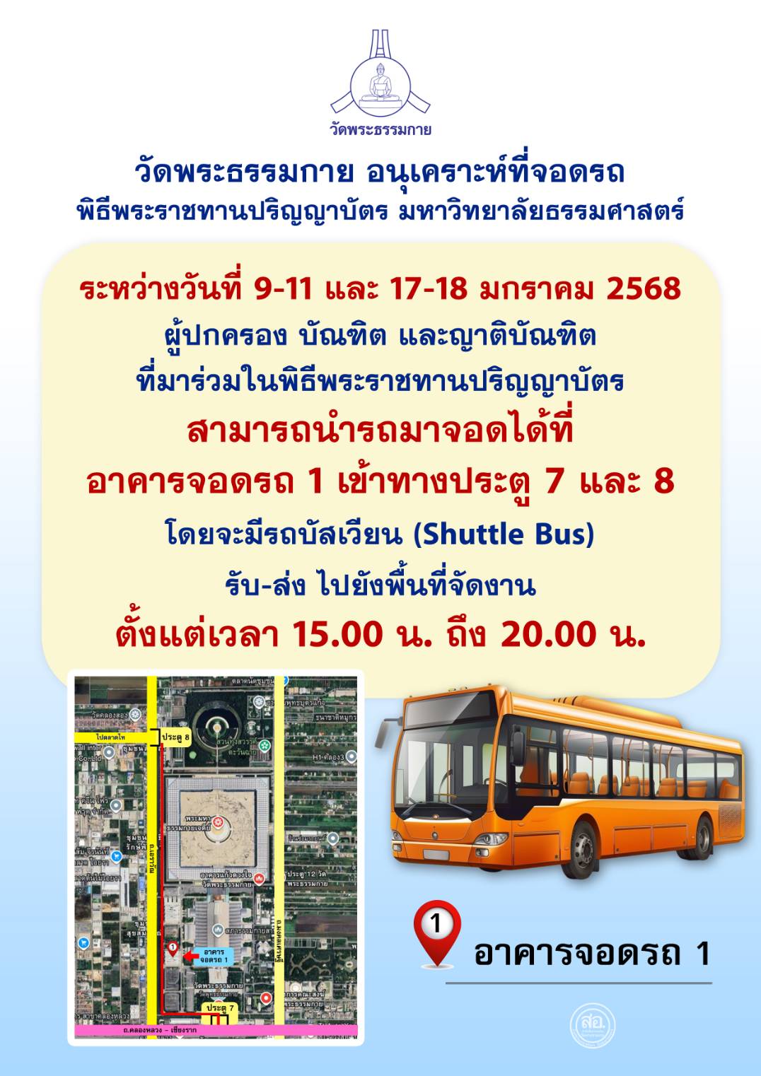 โดยเปิดให้จอดรถในวันที่ 9–11 และวันที่ 17–18 มกราคม 2569 ระหว่างเวลา 15.00–20.00 น. ขณะที่มหาวิทยาลัยธรรมศาสตร์จะดำเนินการจัดรถรับ-ส่ง ระหว่างวัดพระธรรมกายกับมหาวิทยาลัยธรรมศาสตร์ ศูนย์รังสิต ตลอดทั้งวัน
