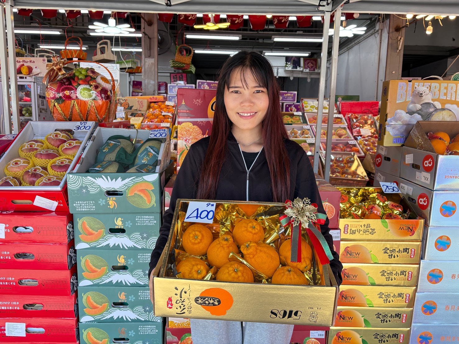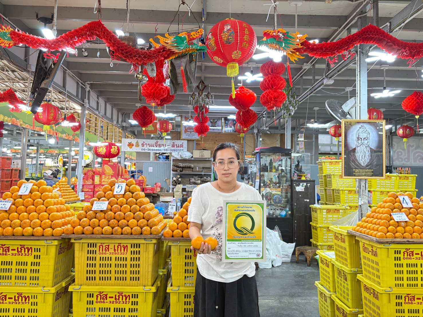 ภายในตลาดมีผลไม้มงคลหลากหลายชนิด อาทิ ส้ม แอปเปิล องุ่น สาลี่ และส้มโอ รวมถึงผลไม้นำเข้าหลายเกรด โดยไฮไลต์คือ “ตลาดส้ม” ที่รวบรวมส้มจากเกษตรกรไทย ได้แก่ ส้มเขียวหวาน ส้มสายน้ำผึ้ง และส้มโชกุน จากแหล่งปลูกคุณภาพ เช่น เชียงใหม่ กำแพงเพชร สุโขทัย และพื้นที่รังสิต–ปทุมธานี ภายใต้แนวคิด “อุดหนุนส้มไทย ส่งสุขให้คนไทย” เพื่อช่วยสร้างรายได้ให้เกษตรกรในประเทศ