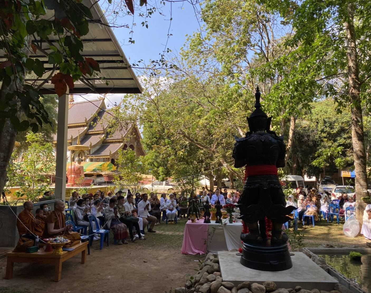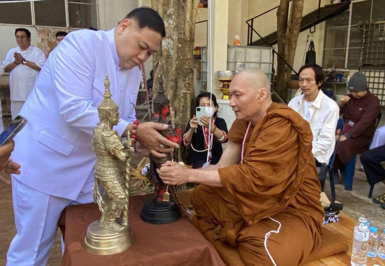 ทั้งนี้ได้รับความเมตตาจากพระณัฐจักร คุณจักโก (ตุ๊ณัฐ ศิษย์หลวงตาม้า) เจ้าอาวาสวัดถ้ำเมืองนะ จังหวัดเชียงใหม่ ประธานพิธีฝ่ายสงฆ์ พร้อม พระปลัด"ปอ"พรหมพจน์ ชยธมฺโม วัดโปรดเกศเชษฐาราม อารามหลวง อำเภอพระประแดง จังหวัดสมุทรปราการและ อาจารย์"โอ๊ก" แอดไทม์ จักรพงศ์ ภู่ทอง /อาจารย์ "หมง" ธนานันท์ เทพศรียันตรา และ อาจารย์"เอ" ปทาน พูลสวัสดิ์ ร่วมประกอบพิธีบวงสรวงอัญเชิญถวายสักการะสิ่งศักดิ์สิทธิ์ องค์เทพเทวา และ ร่วมพลังนำฤกษ์พาคณะมิตรศรัทธาชาวบ้านผู้ใจบุญทุกท่านร่วมสวดมนต์พระมหาคาถาจักรพรรดิ์ 17 จบ พร้อม"ตุ๊ณัฐ"กันเพื่อบรรจุพลังพุทธคุณเทวาคุณในการพิธีเจิมเบิกเนตรถวายองค์ท้าวเวสสุวรรณโณ(ปางเทวาธิรัชชัย)ในครั้งนี้ด้วย