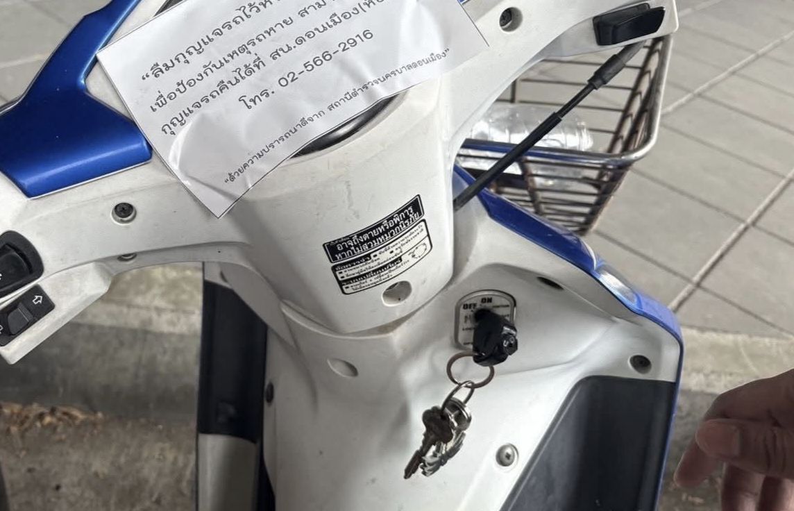จากกรณีวันที่ 4 ก.พ.2569 ช่วงเวลา 15.45น.ที่ผ่านมา พ.ต.ท.ไชยรัตน์ พลหาญ สวป.สน.ดอนเมือง พร้อมเจ้าหน้าที่สายตรวจ ได้ออกตรวจตวามปลอดภัยอาชญากรรมที่เกี่ยวข้องกับทรัพย์สินและอื่นๆ จนกระทั่งผ่านไปบริเวณใต้สถานีรถไฟฟ้าตลาดใหม่ดอนเมือง เขตดอนเมือง กทม. ได้พบรถจักรยานยนต์สีขาวยี่ห้อเวฟ 110 ไม่ติดแผ่นป้ายทะเบียน จอดอยู่จึงเข้าไปตรวจสอบพบว่ามีกุญแจเสียบคาเบ้ากุญแจอยู่ จึงได้ให้เจ้าหน้าที่นำรถจักรยานยนต์คันดังกล่าวมาเก็บรักษาไว้ที่ สน.ดอนเมือง เพื่อเป็นการป้องกันเหตุลักทรัพย์