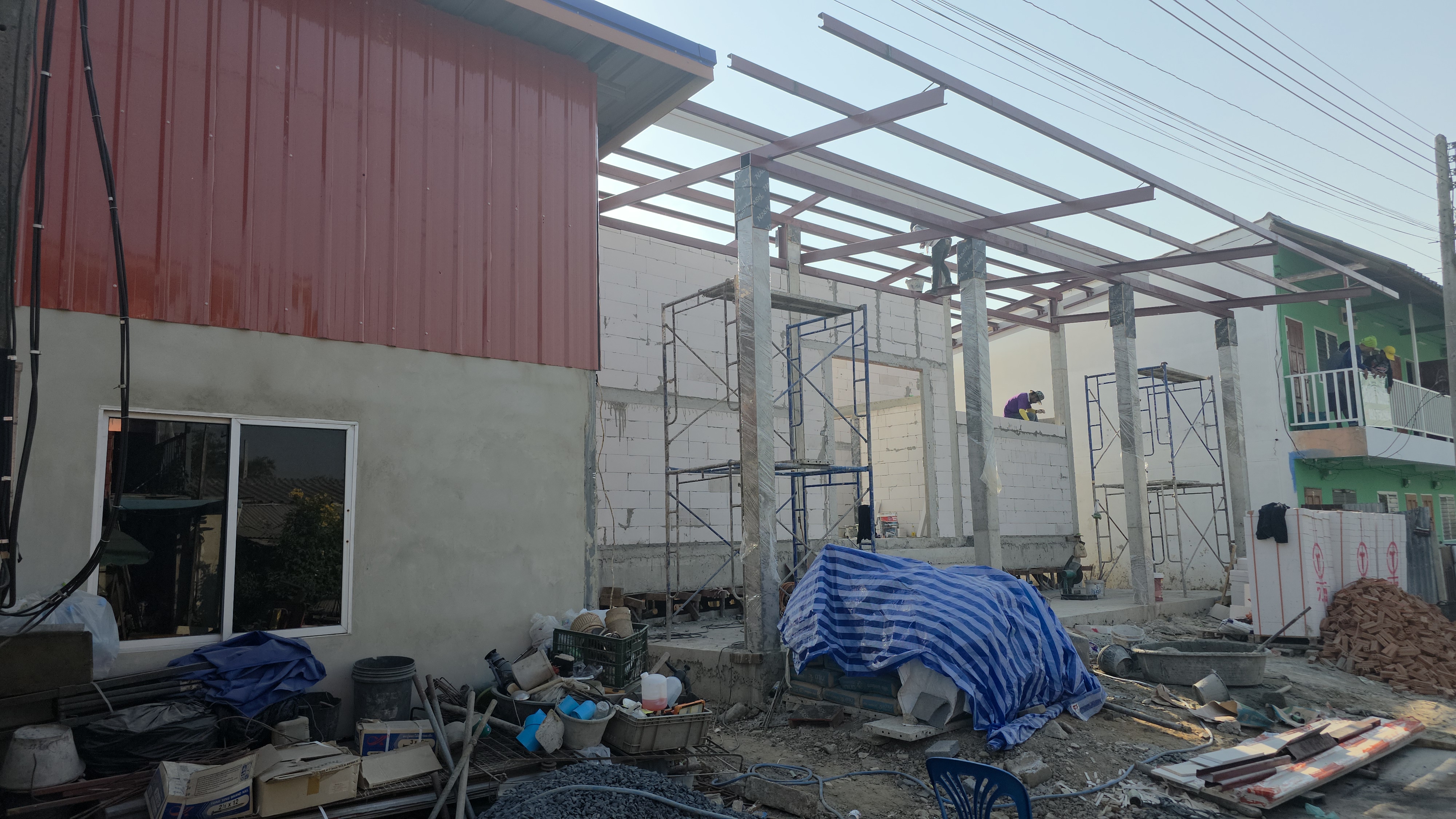 โดยความคืบหน้าของการก่อสร้างได้ดำเนินการเทพื้นคอนกรีตและตั้งเสาโครงสร้างเสร็จสมบูรณ์แล้ว ด้านงานโครงหลังคา ทีมช่างได้ดำเนินการขึ้นโครงหลังคาเหล็กเกือบทั้งหมดแล้ว เพื่อเตรียมการมุงหลังคาในลำดับต่อไป ส่วนงานก่อผนัง ขณะนี้ทีมช่างกำลังเร่งดำเนินการก่อผนังบ้านด้วยอิฐมวลเบาและอิฐแดงในบางส่วน โดยเริ่มเห็นการแบ่งสัดส่วนห้องต่างๆ ภายในบ้านอย่างชัดเจน นอกจากนี้มีการสนับสนุนจากนายสิงหราช เม่งพัด ผู้จัดการฝ่ายขาย ตัวแทนจากดูโฮม ได้นำเครื่องสุขภัณฑ์คุณภาพสูง อาทิ โถสุขภัณฑ์และอ่างล้างหน้า แบรนด์ MARINE มาส่งมอบ ที่ หน้างาน เพื่อเตรียมพร้อมสำหรับการติดตั้งในขั้นตอนงานสถาปัตยกรรมต่อไป