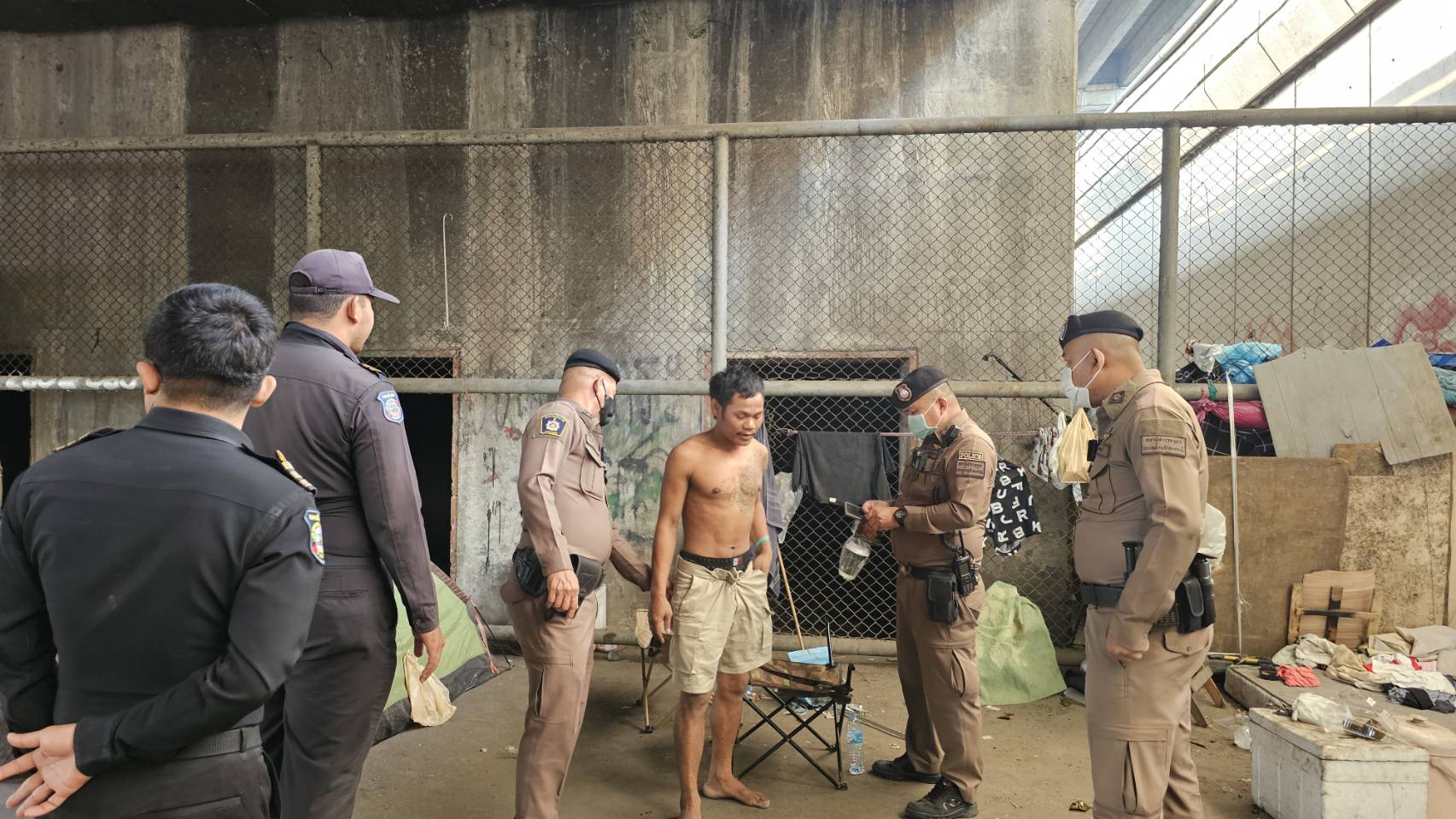 จากการลงพื้นที่ เจ้าหน้าที่พบกลุ่มบุคคลเร่ร่อนรวม 4 ราย อาศัยอยู่ใต้สะพานในสภาพสกปรก มีการกางเต็นท์และวางฟูกที่นอนกีดขวางทางสัญจร จากการตรวจสอบเชิงลึกพบว่ากลุ่มบุคคลดังกล่าวมีพฤติกรรมต้องสงสัย คาดว่าเป็นแก๊งที่ตระเวนลักลอบตัดสายไฟและขโมยอุปกรณ์หลวงของแขวงทางหลวง รวมถึงอุปกรณ์ของชลประทานรังสิตใต้ ซึ่งสร้างความเสียหายให้กับทรัพย์สินทางราชการและสร้างความเดือดร้อนให้ประชาชนมาอย่างต่อเนื่อง ในการตรวจค้นโดยละเอียด เจ้าหน้าที่ถึงกับผงะเมื่อพบของกลางสำคัญ ได้แก่ ยาเสพติด ยาเม็ดสีส้ม (คาดว่าเป็นยาบ้า) บรรจุในซองพลาสติกขนาดเล็ก อุปกรณ์เสพ กระดาษฟอยล์และอุปกรณ์ดัดแปลงสำหรับเสพยาที่ถูกใช้แล้ว บรรจุอยู่ในกล่องพลาสติกใส นอกจากนี้ พื้นที่โดยรอบยังเต็มไปด้วยขยะและสิ่งของที่คาดว่าขโมยมา กองสาธารณสุขฯ จึงได้เร่งดำเนินการเก็บกวาดและทำความสะอาดพื้นที่ทันทีเพื่อสุขอนามัยและความปลอดภัย