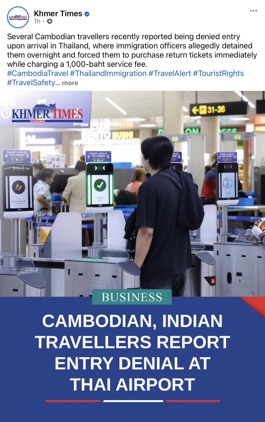 จากกรณีสื่อ Khmer Times ซึ่งเป็นเพจของกัมพูชา เผยแพร่ข่าวเป็นภาษาอังกฤษกล่าวอ้างว่า นักท่องเที่ยวชาวกัมพูชาและชาวอินเดียถูกปฏิเสธการเข้าเมืองที่ท่าอากาศยานในประเทศไทย แถมถูกบังคับให้จองตั๋วกลับโดยด่วน พร้อมถูกเรียกเก็บค่าบริการ 1,000 บาท จนสร้างความเข้าใจผิดต่อนักท่องเที่ยวต่างชาติที่เข้ามาเที่ยวประเทศไทย นั้น