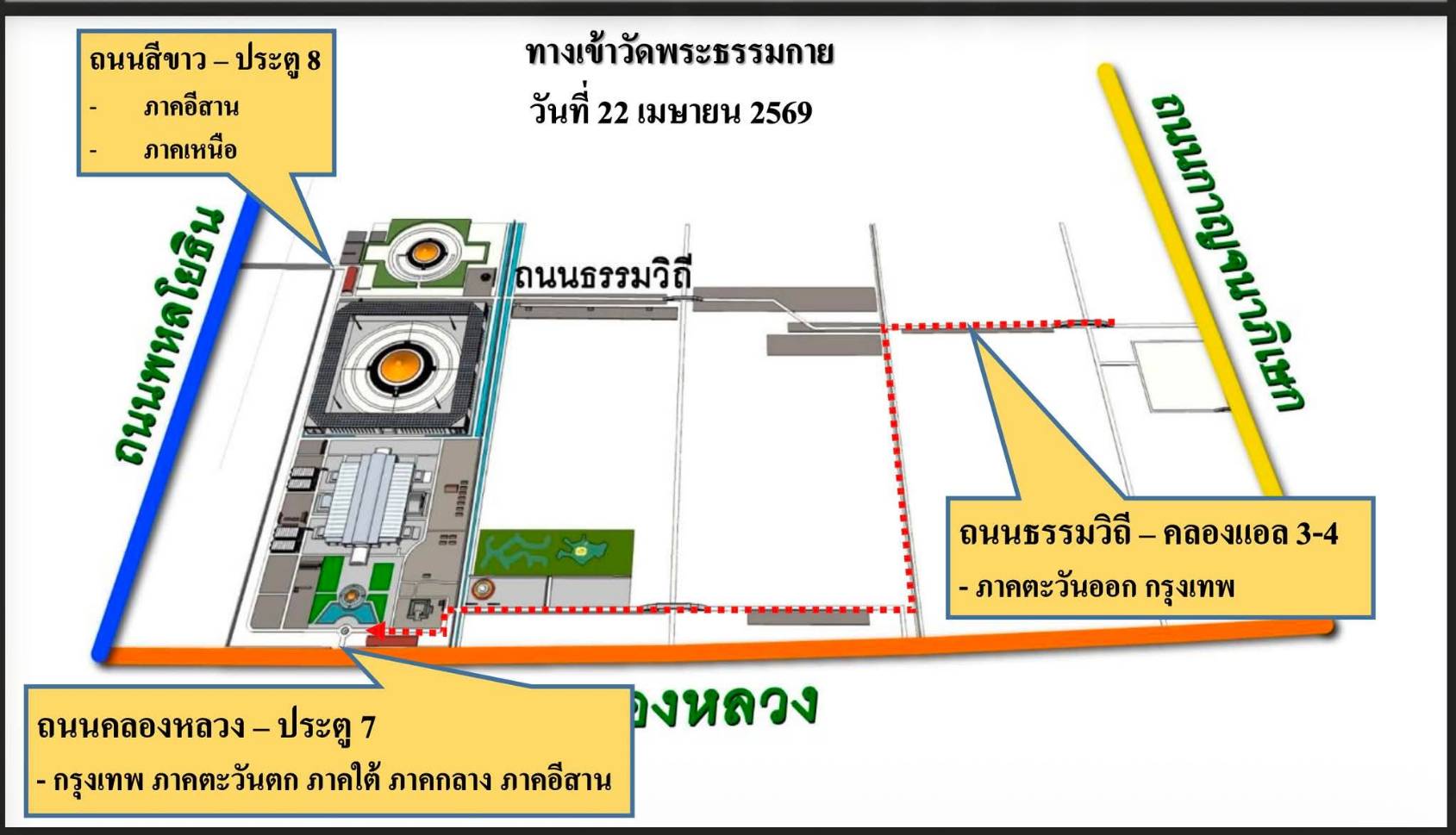 วัดพระธรรมกายได้ประสานความร่วมมือกับเจ้าหน้าที่ตำรวจจราจร และองค์กรปกครองส่วนท้องถิ่นในพื้นที่ พร้อมระดมอาสาสมัครกว่า 1,000 คน ร่วมอำนวยความสะดวกด้านการจราจร จึงขออภัยในความไม่สะดวกต่อประชาชนผู้ใช้รถใช้ถนน โดยคาดว่าการจราจรจะหนาแน่นในช่วงเวลา 08.00 - 15.00 น. และ 17.00 - 20.00 น. และ เพื่อความคล่องตัวในการเดินทาง ประชาชนสามารถใช้เส้นทางลัดในพื้นที่ตำบลคลองสาม ซึ่งเปิดใช้งานเป็นการเฉพาะ และสามารถสอบถามข้อมูลเส้นทางได้ที่ FB “จราจรวัดพระธรรมกาย” และโอเพนแชท “จราจรนิวส์ UPDATE”