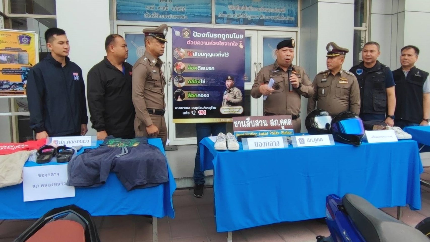พล.ต.ต.ยุทธนา จอนขุน ผบก.จ.ปทุมธานี พ.ต.อ.วิษณุรักษ์ พรหมเมศร์ รองผบก.จ.ปทุมธานี รักษาราชการแทนผกก.สภ.คลองหลวง พ.ต.อ.กานตภณ วรรณา ผกก.สภ.คูคต พ.ต.ท.สิรภพ บัวหลวง สารวัตรสืบสวน (หน.ชุด ศปจร.สภ.คลองหลวง),พร้อมด้วยเจ้าหน้าที่ตำรวจสืบสวน สภ.คูคต เจ้าหน้าที่ตำรวจสืบสวน สภ.คลองหลวง พ.ต.ต.มนตรี คงอาจ สวป.สภ.คลองหลวง พร้อมเจ้าหน้าที่ชุดจับกุม ได้ร่วมกันแถลงข่าวจับกุมคนร้ายลักทรัพย์ 3 คดีใน 3 พื้นที่ ลักรถยนต์และลักรถจักรยานยนต์ได้ของกลางรถจักรยานยนต์จำนวน 5 คัน รถยนต์ยี่ห้อนิสันหมายเลขทะเบียน วบ 9597 กรุงเทพมหานคร จำนวน 1 คัน พร้อมทั้งอุปกรณ์ที่ใช้ในการก่อเหตุลักรถจักรยานยนต์